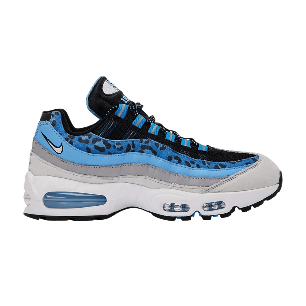 Launching as part of the 'Yardrunners Pack,' the Nike Air Max 95 'Spelman' pays tribute to the Atlanta-based HBCU. The retro runner's signature wavy side panels are highlighted by jaguar spots that adorn the uppermost blue suede overlay, which give way to additional layers in blue leather and gradient grey leather. Contrasting black accents land on the collar lining and tongue, marked with an embroidered Spelman patch and the year of the school's founding. Lightweight cushioning is provided by a white polyurethane midsole with blue-tinged Max Air units.