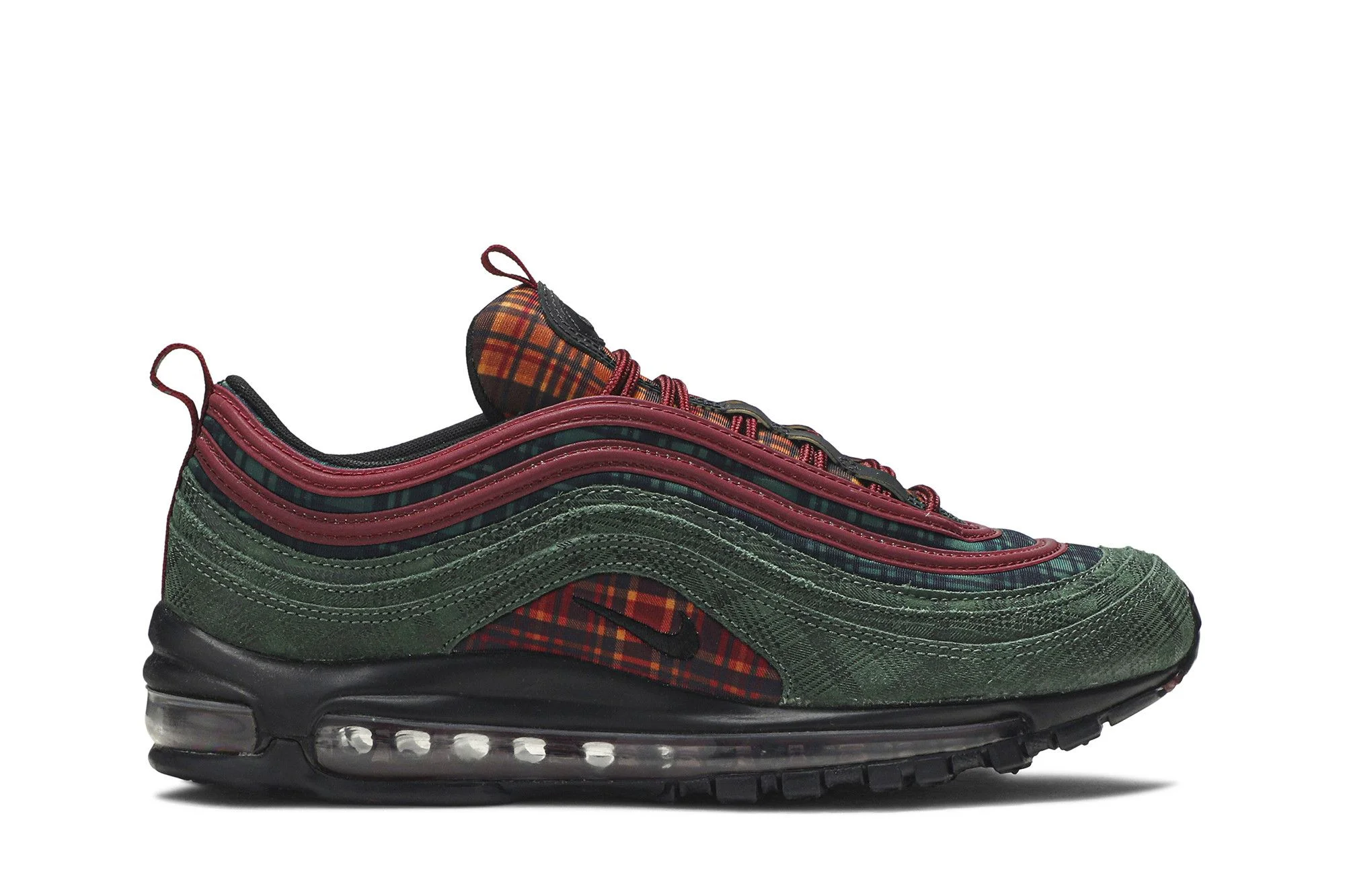 The Nike Air Max 97 NRG 'Jacket Pack' recreates the silhouette with cold weather outerwear-inspired tones, textures and prints. This sneaker was released in November of 2018 and features plaid panels at the tongue and midfoot. The unique palette of this shoe is enhanced with red laces and pull tabs, plus a nubuck leather mudguard cast in Midnight Spruce. This premium NRG sneaker is completed with a full length visible Max Air Unit for a lightweight feel.