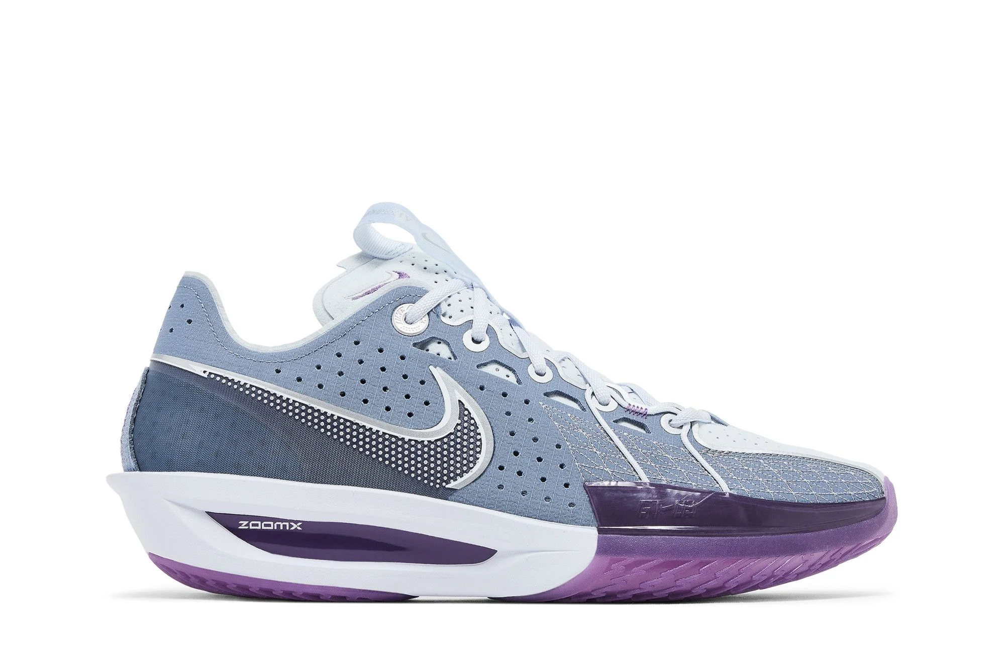 The Nike Air Zoom GT Cut 3 'Be True to Her School' dresses the performance basketball shoe in a perforated textile upper in Ashen Slate, featuring a molded TPU Swoosh and deco embroidery throughout the forefoot. Inside the shoe, mismatched Nike and 'Be True to Her School' branding embellishes the insole of the left and right shoe, respectively. The low-top rests on a full-length ZoomX foam midsole for ultra-responsive cushioning. A purple-tinged translucent rubber outsole wraps up the toe for enhanced durability and grip. UPPER MATERIAL Textile