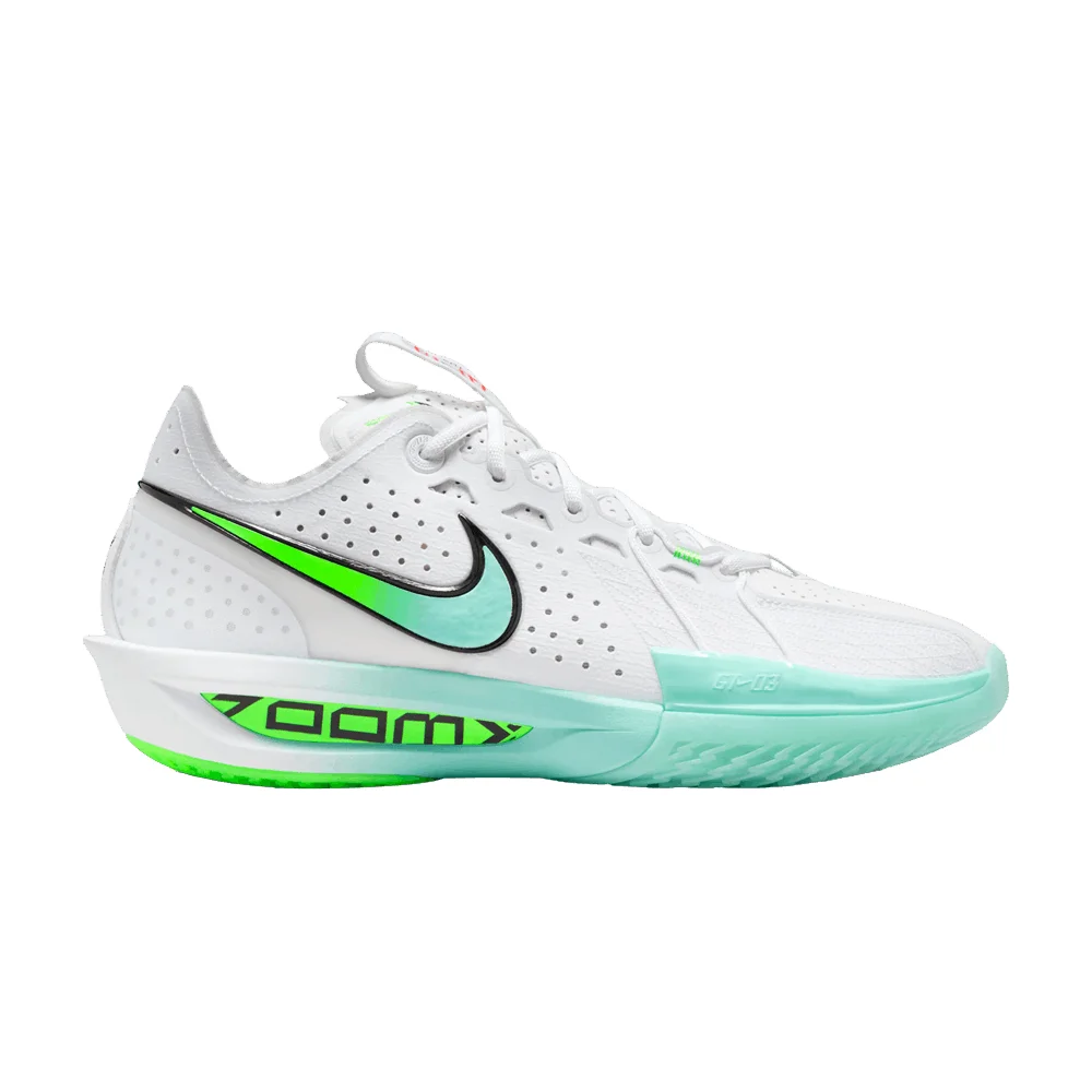 The Nike GT Cut 3 'Bleached Turquoise' features a white synthetic upper with Flywire cables integrated into the laces for forefoot containment. A signature Swoosh adorns the quarter panel in a gradient blend of Green Strike and Bleached Turquoise. The latter hue is applied to the midsole, which combines responsive ZoomX cushioning with a Phylon foam carrier. Underfoot, the translucent rubber outsole utilizes a modified herringbone traction pattern for multi-directional grip. UPPER MATERIAL Textile
