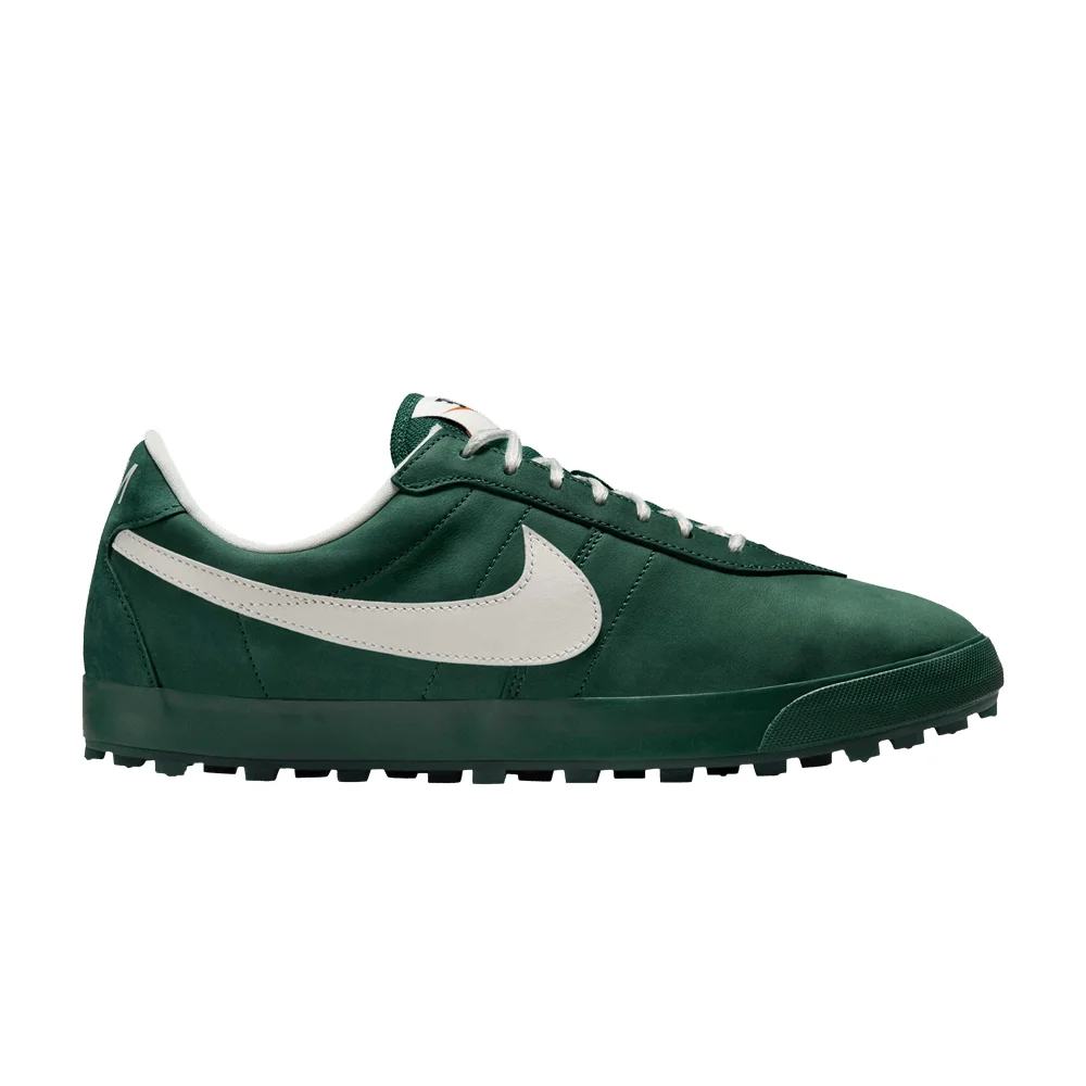 The Nike Astro Grabber 'Fir Sail' makes use of a dark green nubuck upper, contrasted by off-white accents on the textile collar lining and leather Swoosh. Nike branding appears on the woven tongue tag, sockliner and back tab. The vintage football shoe sits atop a matching green midsole, supported by a lugged rubber outsole optimized to grip the astroturf that lined American football fields during the 1970s. UPPER MATERIAL Nubuck
