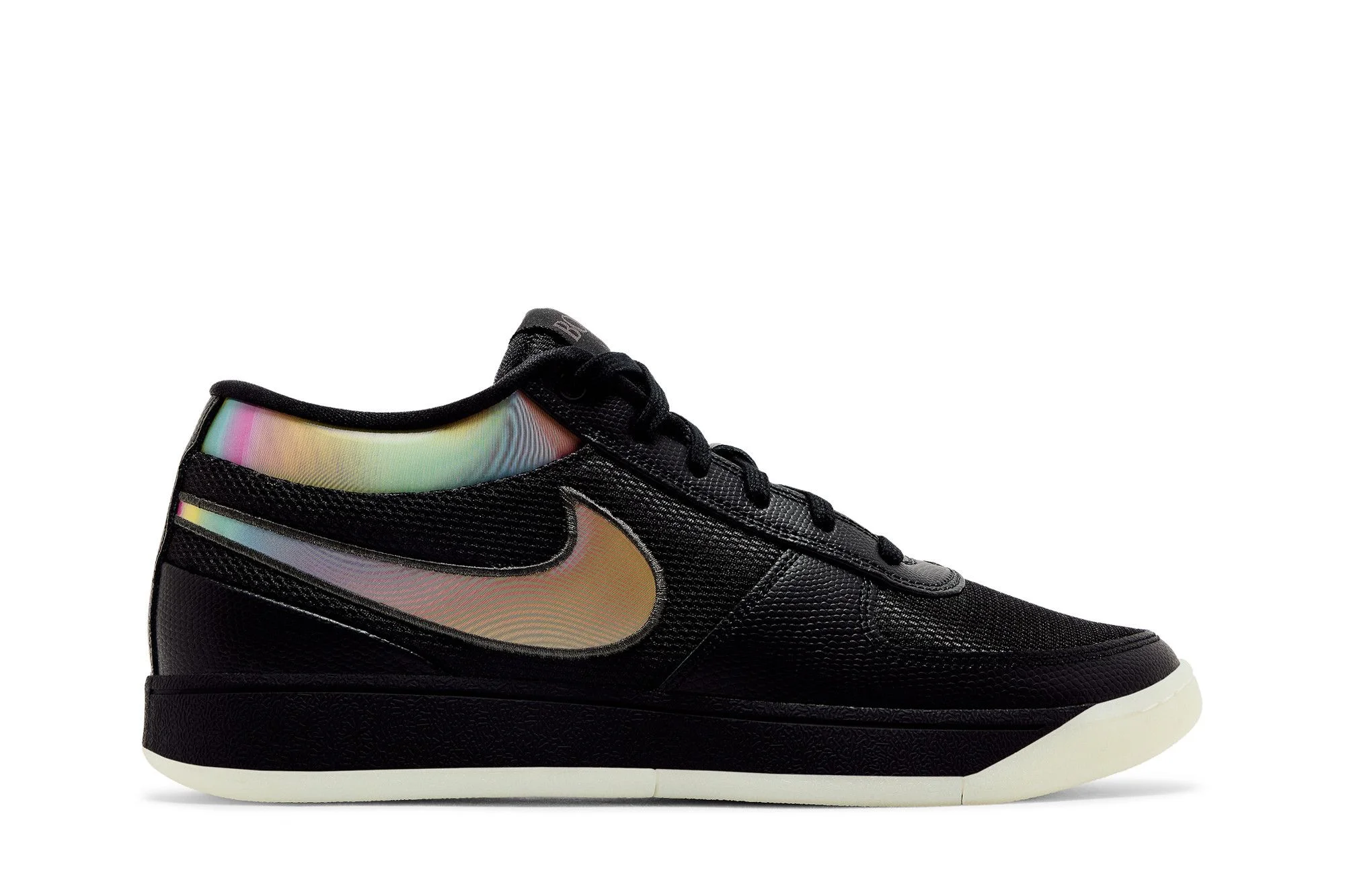 The Nike Book 1 'Night' showcases a black mesh upper with tonal leather overlays in a subtle reptilian texture. The neutral design is enlivened with an iridescent Swoosh and collar, both featuring a prismatic blend of colors. A woven 'Book' tag adorns the tongue, while 'Chapter One' is etched on the back heel. Anchoring the sneaker is a black Cushlon midsole, reinforced with a rigid TPU sidewall and fitted with a top-loaded Zoom Air unit in the heel. UPPER MATERIAL Mesh