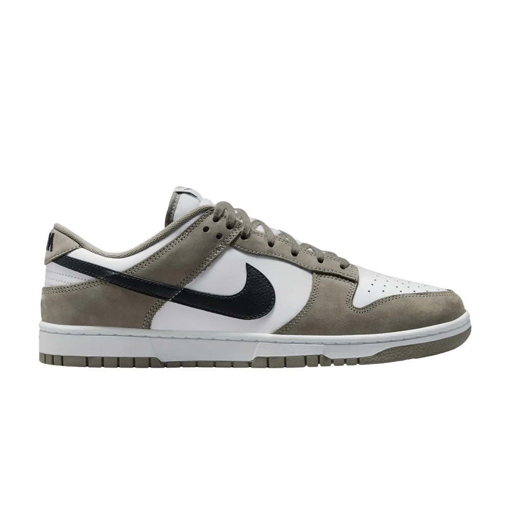 The Nike Dunk Low 'Light Army' features a crisp white leather upper with contrasting nubuck overlays in a neutral olive green hue. A black leather Swoosh matches the embroidered Nike wordmark on the back tab. Additional Nike branding appears on the woven tongue tag and sockliner. The sneaker is mounted on a durable rubber cupsole, highlighted by white sidewalls and a subdued olive green outsole. UPPER MATERIAL Suede