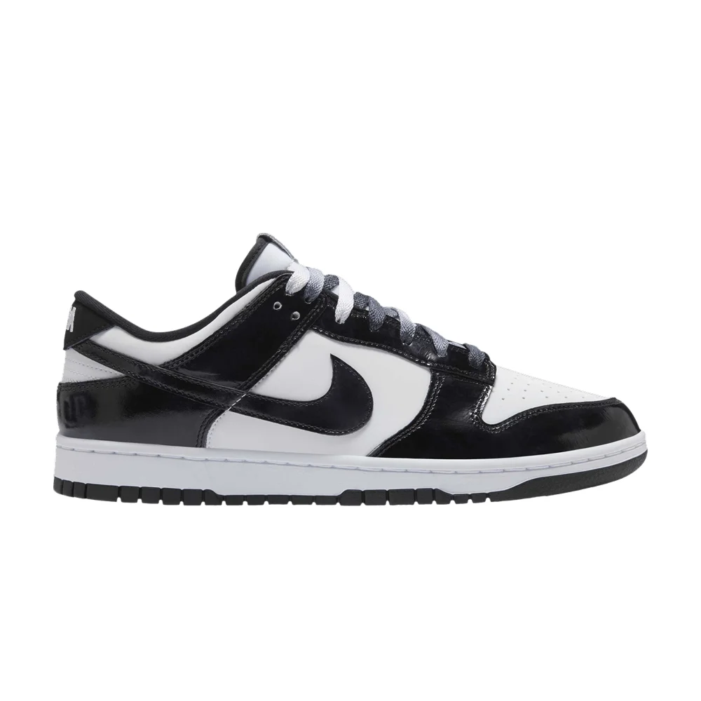 The Nike Dunk Low SE 'Panda-Monium Pack - Black' showcases a neutral two-tone design and a refreshed build. Gradient white and black laces secure the white leather upper, contrasted by black patent leather on the forefoot and heel overlay, as well as the signature Swoosh. Atop the tongue, a leather tag displays Nike branding on the exterior side. The interior side is marked with a debossed Panda graphic and a caption that reads 'EST. 1985.' UPPER MATERIAL Leather