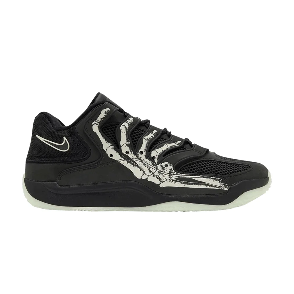 The Nike KD 18 'Halloween' celebrates spooky season with a blacked-out upper, crafted from breathable mesh with durable synthetic leather overlays. On the lateral side, a large graphic depicting a skeletal hand adorns a distinctive midfoot cage inspired by the Air Terra Humara. Kevin Durant's signature model sits atop a matching black Cushlon foam midsole with Zoom Air cushioning in the forefoot and heel. A glow-in-the-dark rubber outsole provides grippy traction underfoot. UPPER MATERIAL Mesh