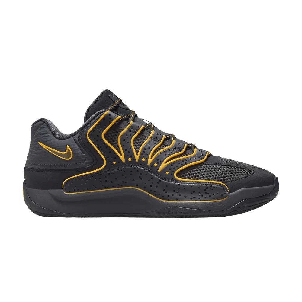 The Nike KD 18 'Rain City' pays tribute to the Seattle Supersonics, the NBA team that selected Kevin Durant with the second overall pick in the 2007 draft. Anthracite-colored mesh is utilized on the upper, fortified with black synthetic leather overlays and a tonal midfoot cage outlined in University Gold trim. Performance benefits include a lightweight Cushlon midsole with Zoom Air cushioning in the forefoot and heel. UPPER MATERIAL Mesh