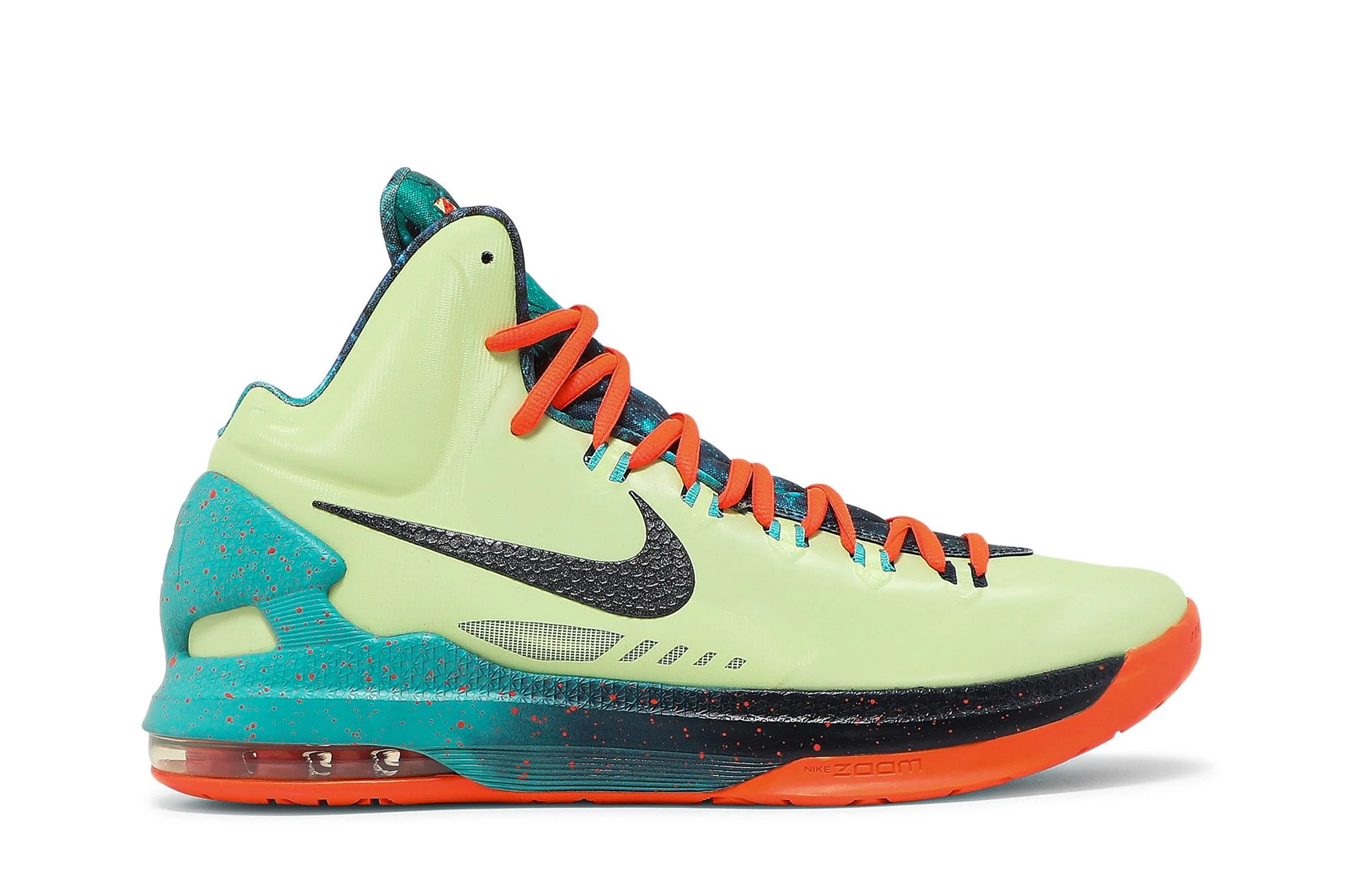 Nike joined forces with basketball star, Kevin Durant, for a collaboration to commemorate the 2013 All-Star Game. Released in February of 2013, the Nike KD 5 All-Star 'Extraterrestrial' sneaker features a Liquid Lime-based colorway, accented by a galaxy-inspired print at the tongue and a textured Nike Swoosh. The sculpted exterior is enforced by a molded heel strap and cushioned midsole to provide optimal support and mobility for extended wear.
