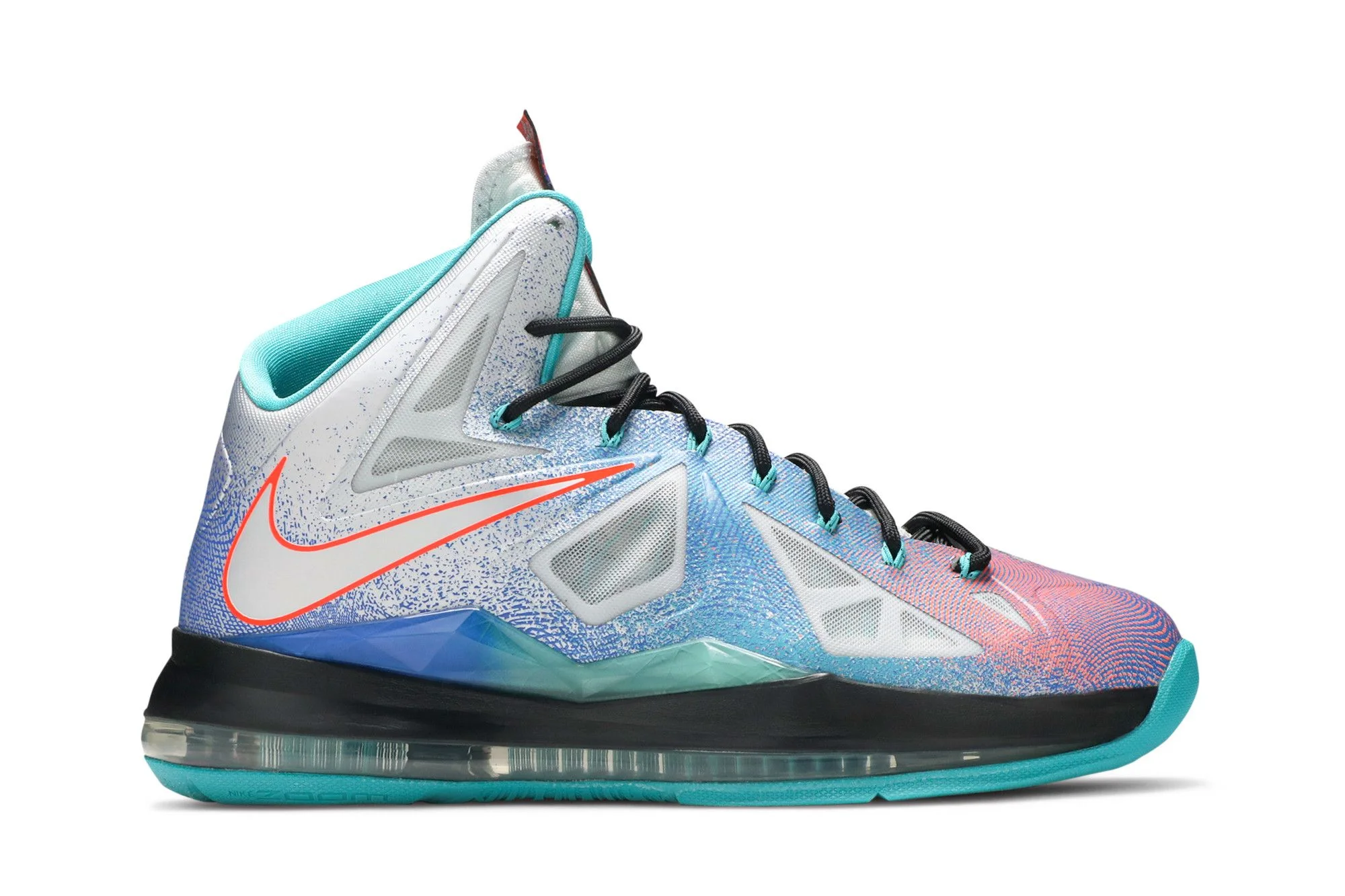 The Hyperfuse upper on the Nike LeBron 10 ‘Pure Platinum’ features a metallic silver base blended with a mix of bright blue, teal, pink and purple. The complementary hues, further embellished with a unique fingerprint pattern, are contrasted by solid hits of black on the laces, midsole and signature Swoosh on the toe. Additional pops of color come courtesy of Sport Turquoise on the collar lining, Flywire cables and rubber outsole.