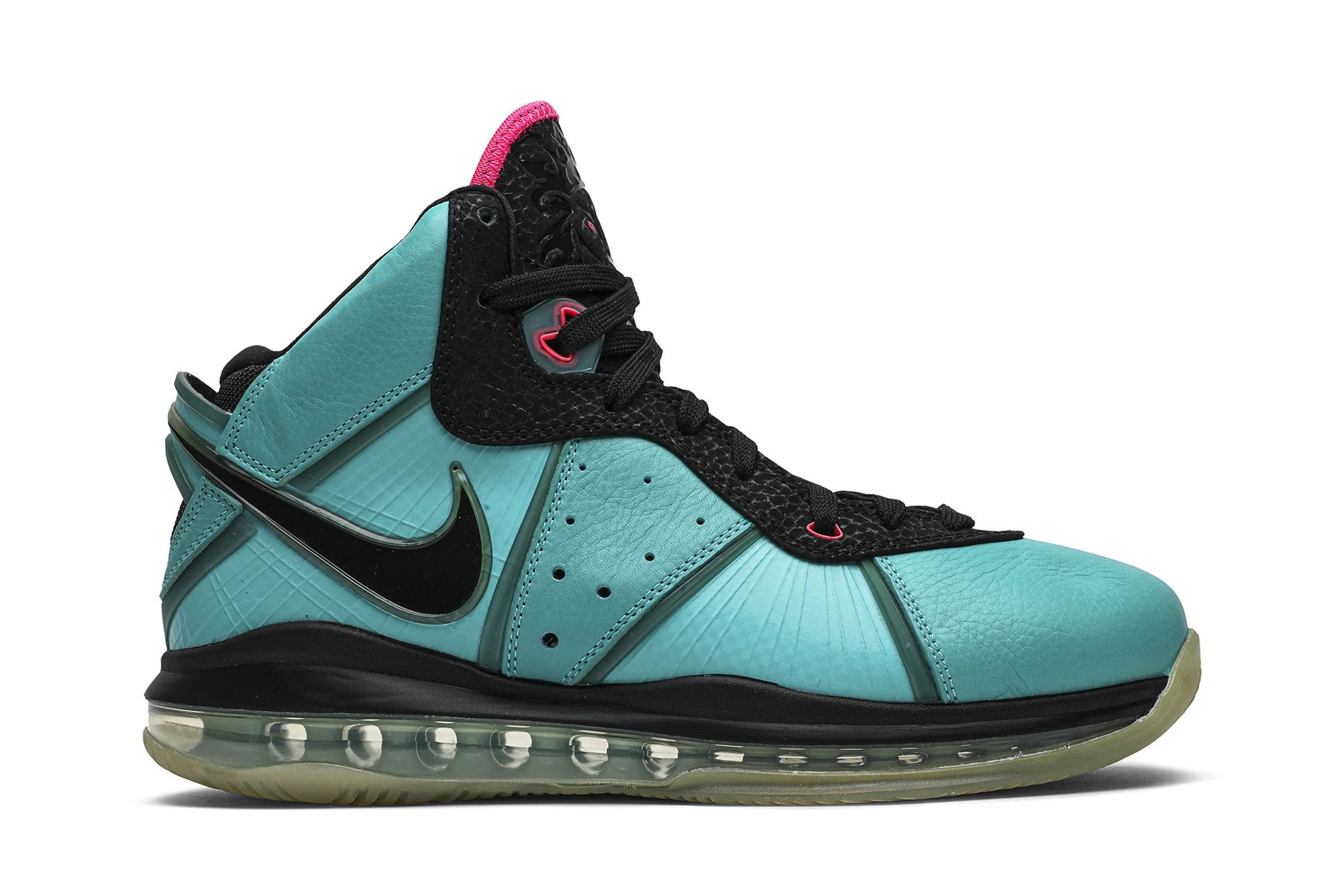 Reflecting LeBron James’ time in Miami, the Nike LeBron 8 ‘South Beach’ is finished in a distinctive South Beach-inspired color palette. Filament Green covers the upper, featuring a combination of leather and Flywire-infused TPU panels, contrasted by hits of black on the eyestay, tongue, Swoosh and midsole. Vibrant pops of Pink Flash stand out on the tongue, eyelets and LeBron James’ signature on the heel. The shoe’s Max Air 360 unit is reinforced underfoot by a translucent rubber outsole. UPPER MATERIAL Leather