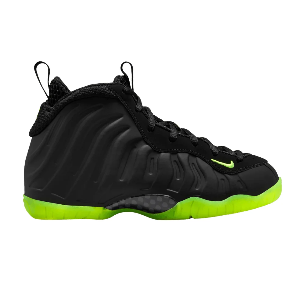 Offered in preschool sizing, the Nike Little Posite One PS 'Black Volt' features a black Foamposite upper with a tonal knit collar and synthetic nubuck construction on the eyestay. The latter is marked with a Volt-colored mini-Swoosh on the lateral side. Additional hits of neon green land on a pair of webbing pull tabs, as well as Penny Hardaway's 1 Cent logo on the tongue and back heel. UPPER MATERIAL Foamposite
