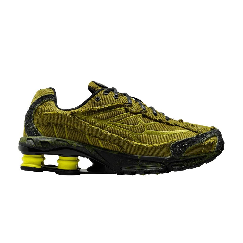 The Nike Shox Ride 2 'Bright Cactus Denim' showcases a pre-distressed aesthetic, highlighted by frayed edges on a washed denim upper in a muted chartreuse hue. Tonal embroidery outlines adorns the side panels, while green shaggy suede overlays reinforce the forefoot and heel. The sneaker rests on a dark green foam midsole, augmented with visible Max Air units in the forefoot and a quartet of Nike Shox pillars under the heel. UPPER MATERIAL Denim