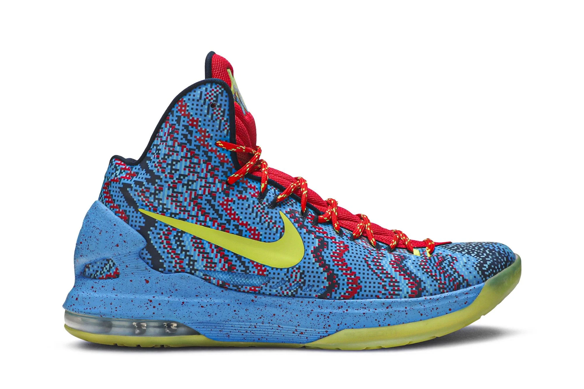 Kevin Durant debuted the Zoom KD 5 'Christmas' sneaker on-court during an Oklahoma City Thunder and Miami Heat game on Christmas day in 2012. Part of a three-sneaker holiday pack that includes colorways from LeBron James and Kobe Bryant, this vibrant sneaker is inspired by video game graphics and Durant’s childhood memory of receiving a video game system one Christmas. The shoe features a pixelated print in bright blue, red and Volt coloring and features a video game-inspired sockliner graphic.