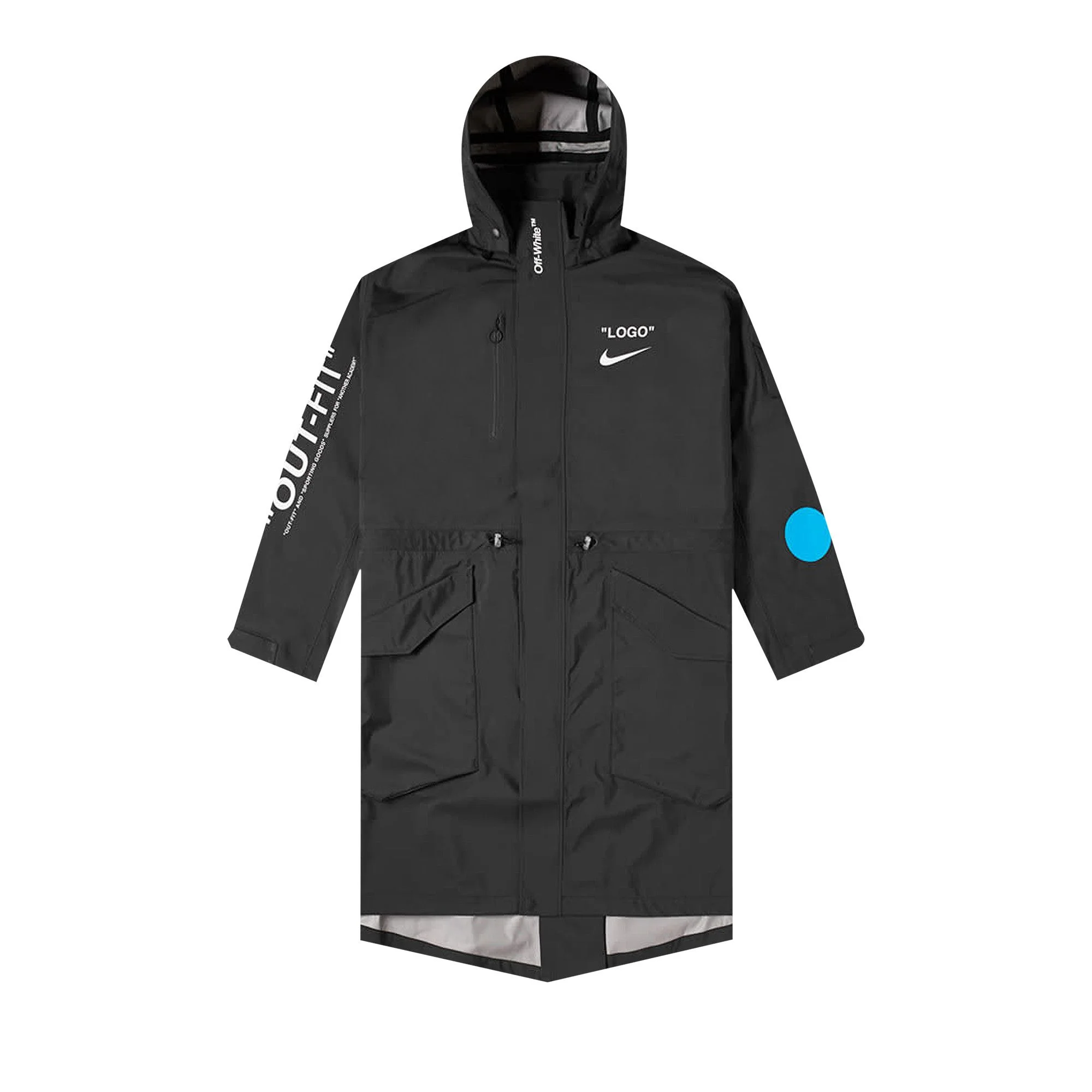 NikeLab and Off-White created this Mercurial NRG X jacket for the SS18 season. The black outerwear piece is topped with a hood and printed with white text graphics that reflect Off-White's stylized use of quotations. The word "Logo" appears above Nike's Swoosh on the chest, while "Out-Fit" is stamped on the right sleeve.