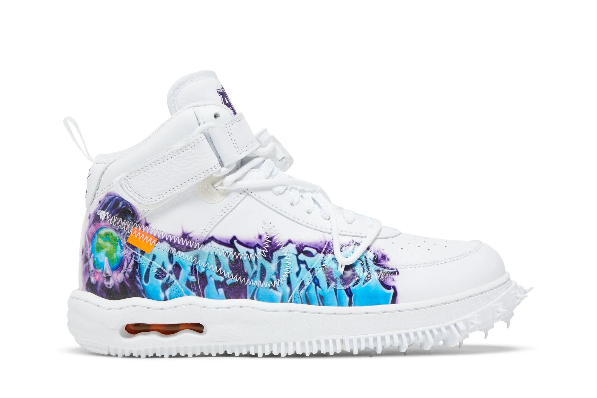 The Off-White x Nike Air Force 1 Mid ‘Graffiti’ showcases a unique design inspired by the world of street art. Secured with an adjustable ankle strap and a dual lacing system, the white leather upper features translucent Swooshes and an airbrush-style Grim Reaper graphic on the lateral side. The standard Off-White logo script decorates the shoe’s medial side, while stylized ‘Air’ branding graces the tongue in purple embroidery. The sneaker rides on a wavy midsole, fitted with an orange-tinged Air-sole unit and supported by a spiked rubber outsole. UPPER MATERIAL Leather
