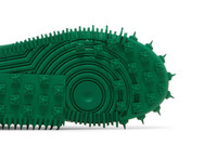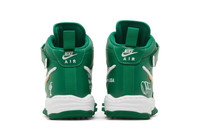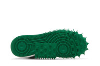 The Off-White x Nike Air Force 1 Mid SP Leather ‘Pine Green’ continues the creative legacy of Virgil Abloh with the designer’s signature flourishes. The green leather upper is secured with standard laces and a secondary lacing system that feeds through a series of exposed Flywire cables. Contrasting white Swooshes are embellished with tonal zigzag stitching and a rectangular orange tab on the lateral side. ‘AIR’ is embroidered on the tongue, while mismatched graphics on the lateral heel pair a candelabra with an ‘OFF’ wordmark. Tinged in orange, a visible Air-sole unit is nestled in the heel of the white midsole, accented with a wavy topline and supported by a spiked rubber outsole. UPPER MATERIAL Leather