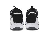 The PG 4 'Oreo' lives up to the sneaker’s unofficial moniker with a fitting black and white color scheme. The zippered mesh overlay that covers the upper of Paul George’s signature shoe uses split color blocking, with solid white on the lateral side and semi-transparent black on the opposite side. A speckled foam midsole rides on a black rubber outsole, featuring a circular traction pattern that delivers multidirectional grip on the hardwood.