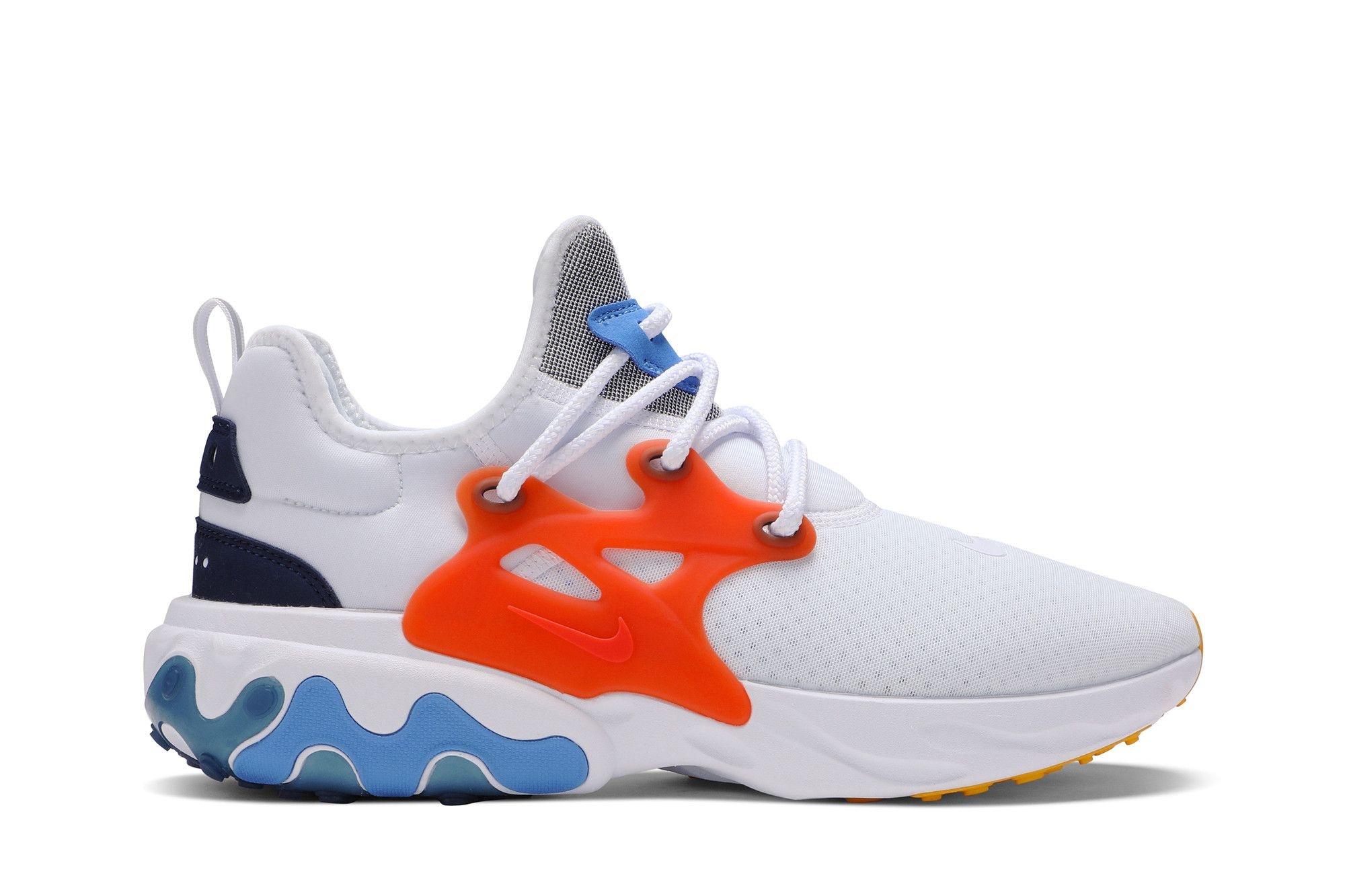 Building upon the 2000 Air Presto legacy and revamping it with React technology, Nike released the React Presto 'Breezy Thursday' sneaker in May 2019. Inspired by Summer days, the shoe is dressed in a vibrant colorway with playful beach ball accents on insole. The stretch textile upper is reinforced by a TPU lacing cage, shaped in a natural, contoured silhouette. Bouncy React foam completes the design.