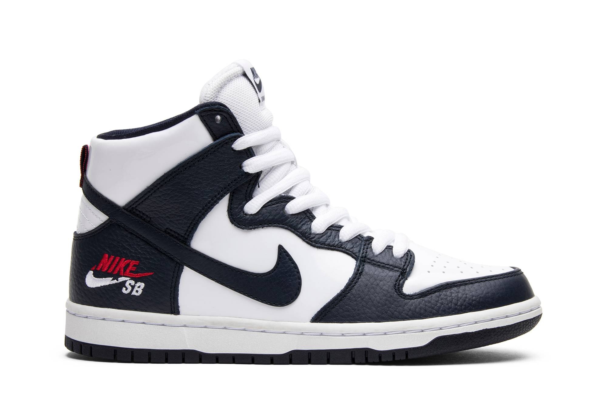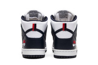 A patriotic color scheme covers this ode to the 1992 Olympics USA men’s basketball team. The SB Dunk High Pro 'Dream Team' features a premium white leather upper with Obsidian leather overlays on the mudguard, eyestay, side panel, and collar lining. The sneaker also boasts thick white laces, a padded tongue for comfort, and University Red details heel branding as the final reference the American colors.