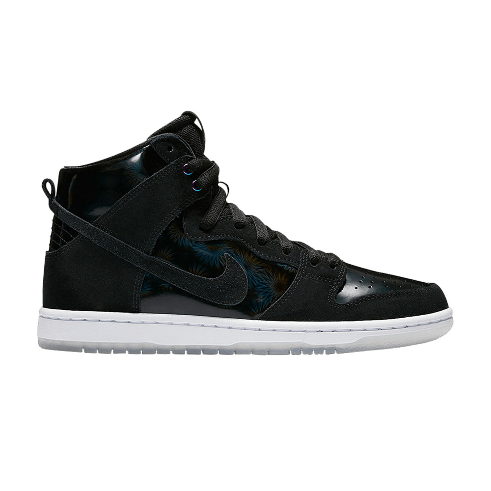 Released 15 years after the first Nike Dunk with Zoom cushioning, the SB Zoom Dunk High Pro brings an iridescent update to the iconic shoe. The upper features a dark color scheme on its suede and patent leather construction, with the flashy details appearing on the latter element. Additional hits of color are applied to the eyelets and aglets. A white midsole gives way to a translucent outsole.