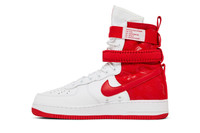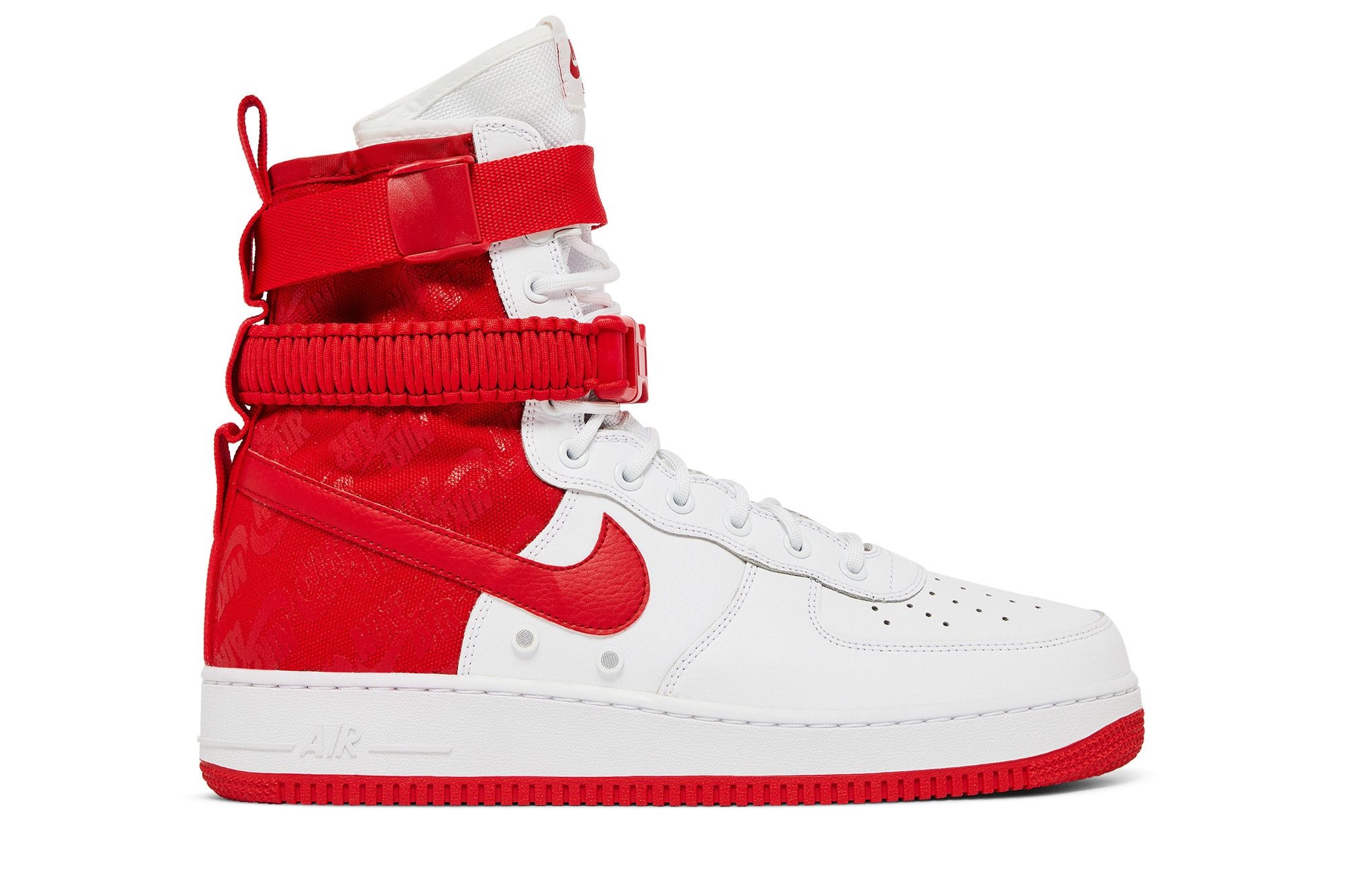Released in May 2018, the Nike SF Air Force 1 High 'University Red' is a hybrid of the AF1 and military-inspired Nike Special Field boot. This sneaker's upper is split in two-tone leather and ballistic nylon with embossed branding on the counter. The classic ankle strap and paracord are secured by a multi-loop system on the heel. Additional logos decorate the tongue, laterals and footbed. The shoe's signature circular traction is steeped in bold red.