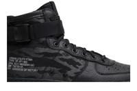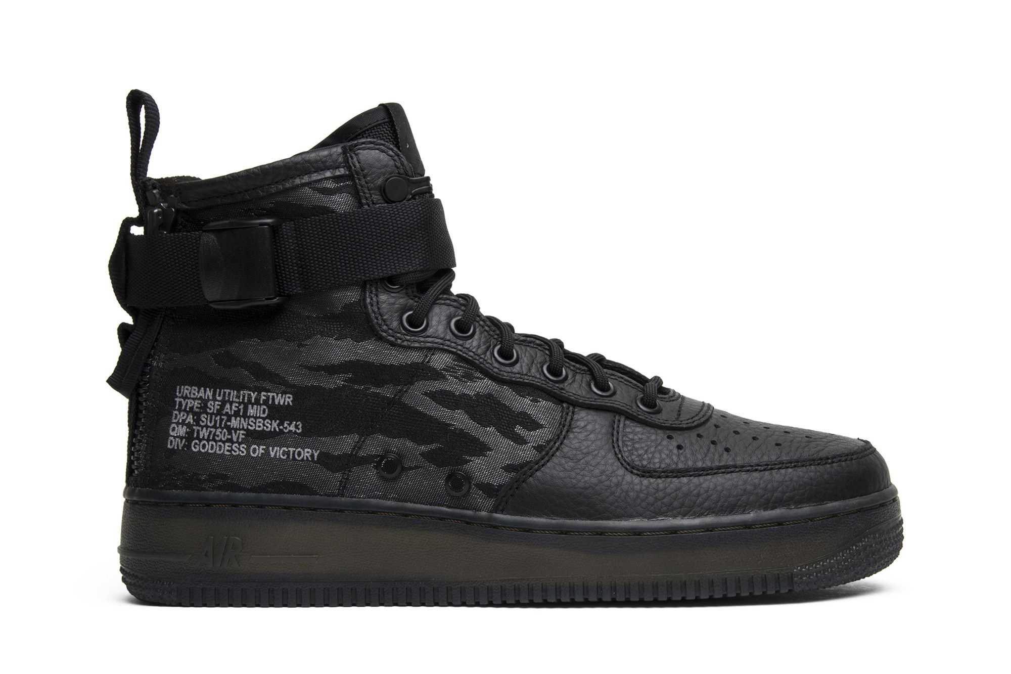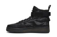 The Nike Special Field Air Force 1 Mid 'Tiger Camo' is a mid-top silhouette that dropped in June 2017. The sneaker features a black leather upper with black and grey tiger stripe camo on the ballistic nylon heel. Other details include reflective silver Military-style branding on the lateral heels, dual heel zippers, and a translucent Air Force 1 midsole/outsole.