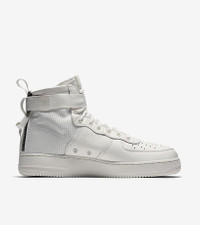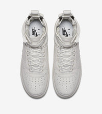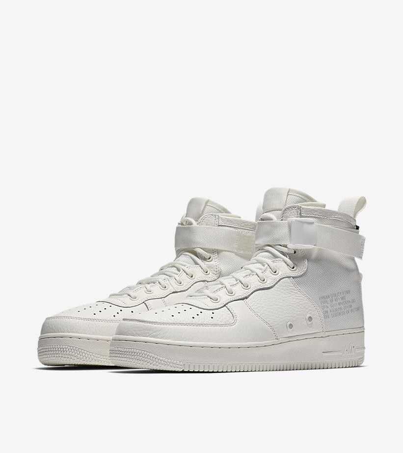 The Nike Special Field Air Force 1 Mid 'Triple Ivory' is a mid-top silhouette that dropped in June 2017. The sneaker features an ivory leather upper with canvas on the heel. Other details include metallic military-style branding on the lateral heels, dual heel zippers, and an ivory Air Force 1 midsole/outsole.