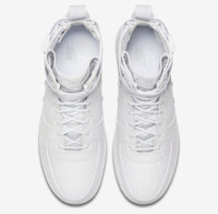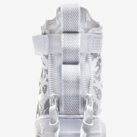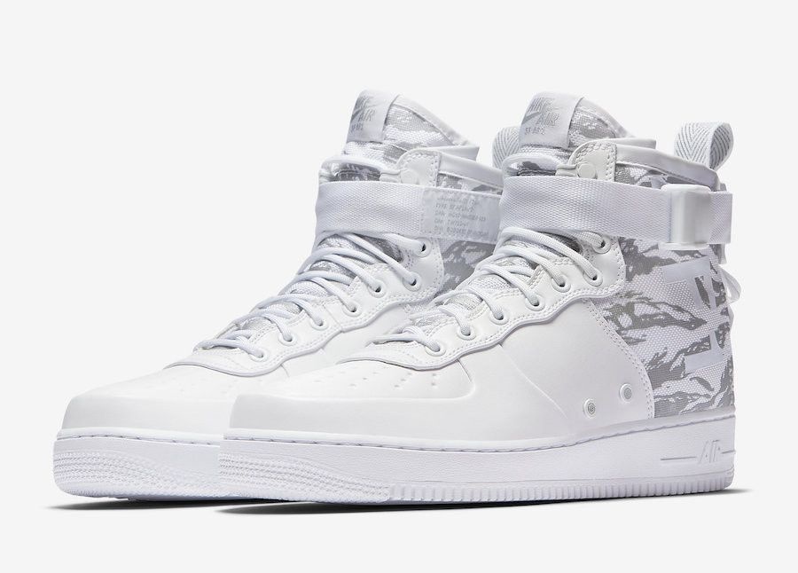 Preparing you for any weather, the Special Field Air Force 1 features rugged materials and construction inspired by the Nike SFB boot. This SF-AF1 Mid ‘Winter Camo’ colorway features clean white synthetic leather on the toe box, mudguard, and eyelets. The heel area is constructed of ballistic nylon and sports a reflective silver camo pattern along with a large ‘AF1’ graphic. Other details include a white ankle strap, a dual-zipper heel, and a white rubber sole with Nike Air cushioning.
