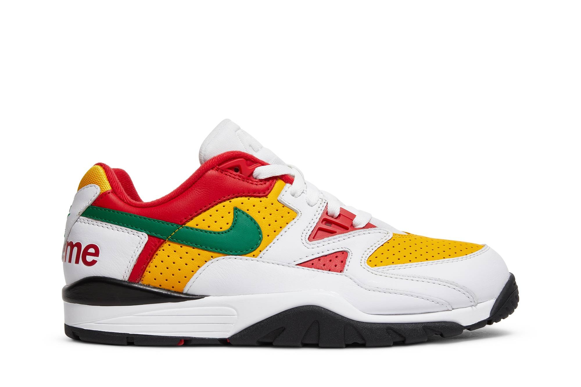 Made exclusively for the New York skate brand, the Supreme x Nike Air Cross Trainer 3 Low ‘White University Gold’ delivers a vibrant colorway of a retro silhouette originally released in 1990. The all-leather upper features a yellow perforated base with crisp white overlays and a green Swoosh. Contrasting crimson accents land on the low-cut collar, interior lining and molded eyelets. A matching red Supreme wordmark wraps around the back heel, while embossed Nike branding decorates the DURAPLUSH tongue. A foam midsole packs encapsulated Air-sole cushioning in the heel for a smooth ride. UPPER MATERIAL Leather