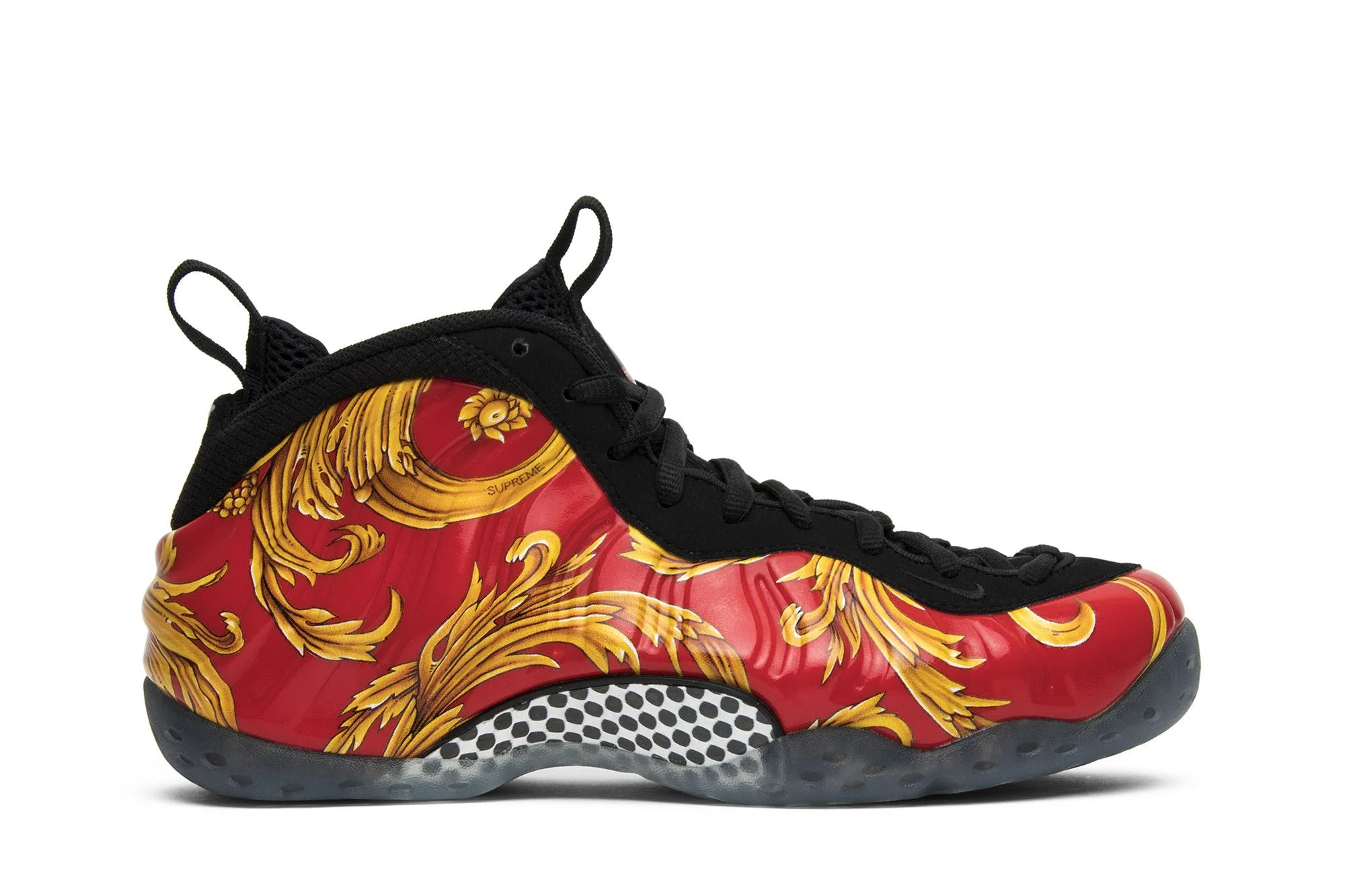This Air Foamposite One ‘Red' was created to commemorate Supreme’s 20th anniversary. It features a Sport Red Foamposite shell upper with a Versace-inspired metallic gold foliage motif, complemented by black nubuck on the throat and collar and subtle Supreme branding on the mesh tongue. It also boasts a black and white carbon fiber shank and a translucent outsole with a black solid rubber insert. UPPER MATERIAL Foamposite