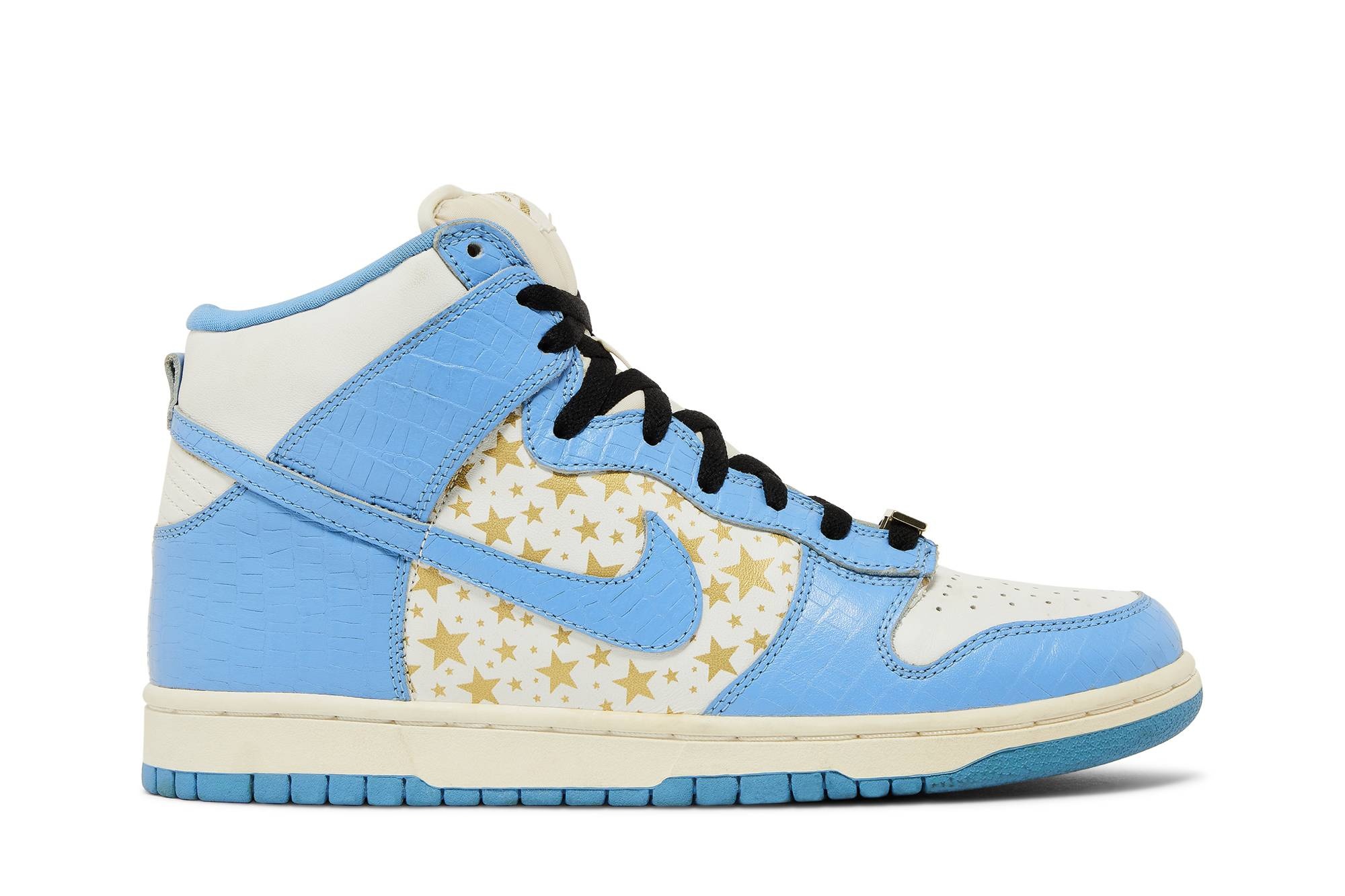 For Supreme’s second collaboration with Nike SB in 2003, the New York City streetwear brand borrowed three colorways from Nike's 1985 Be True To Your School college Dunk collection. This ‘University Blue’ colorway features a white leather upper with University Blue faux-crocodile skin overlays, framing a gold star pattern on the quarter panel. The oversized padded tongue is finished in white, while a Supreme-branded lace deubre emerges in gold. Part of an extremely limited release, the colorway launched alongside ‘College Orange’ and ‘Varsity Red’ models.