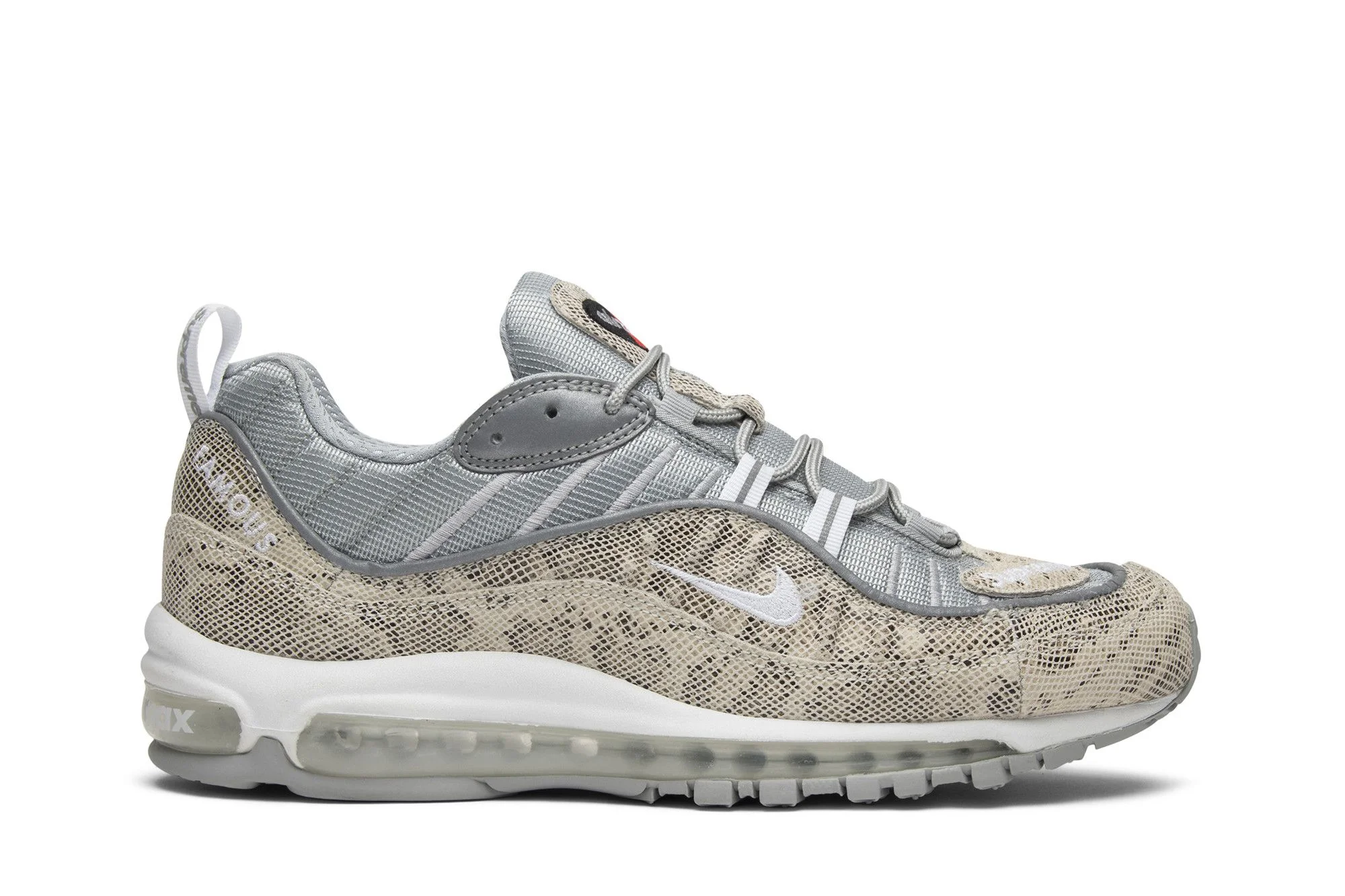 The Supreme x Nike Air Max 98 'Snakeskin’ features a metallic silver mesh upper with reflective piping and Sail snakeskin overlays. The sneaker also comes with Supreme branding at the heel tabs and toe, ‘WORLD FAMOUS’ branding at the heels, a white full-length Air unit, and a silver rubber outsole. Released in April 2016, the ‘Snakeskin’ dropped alongside ‘Black,’ ‘Red,’ and ‘Blue’ colorways and a co-branded Dri-FIT running hat in five colors. UPPER MATERIAL Leather