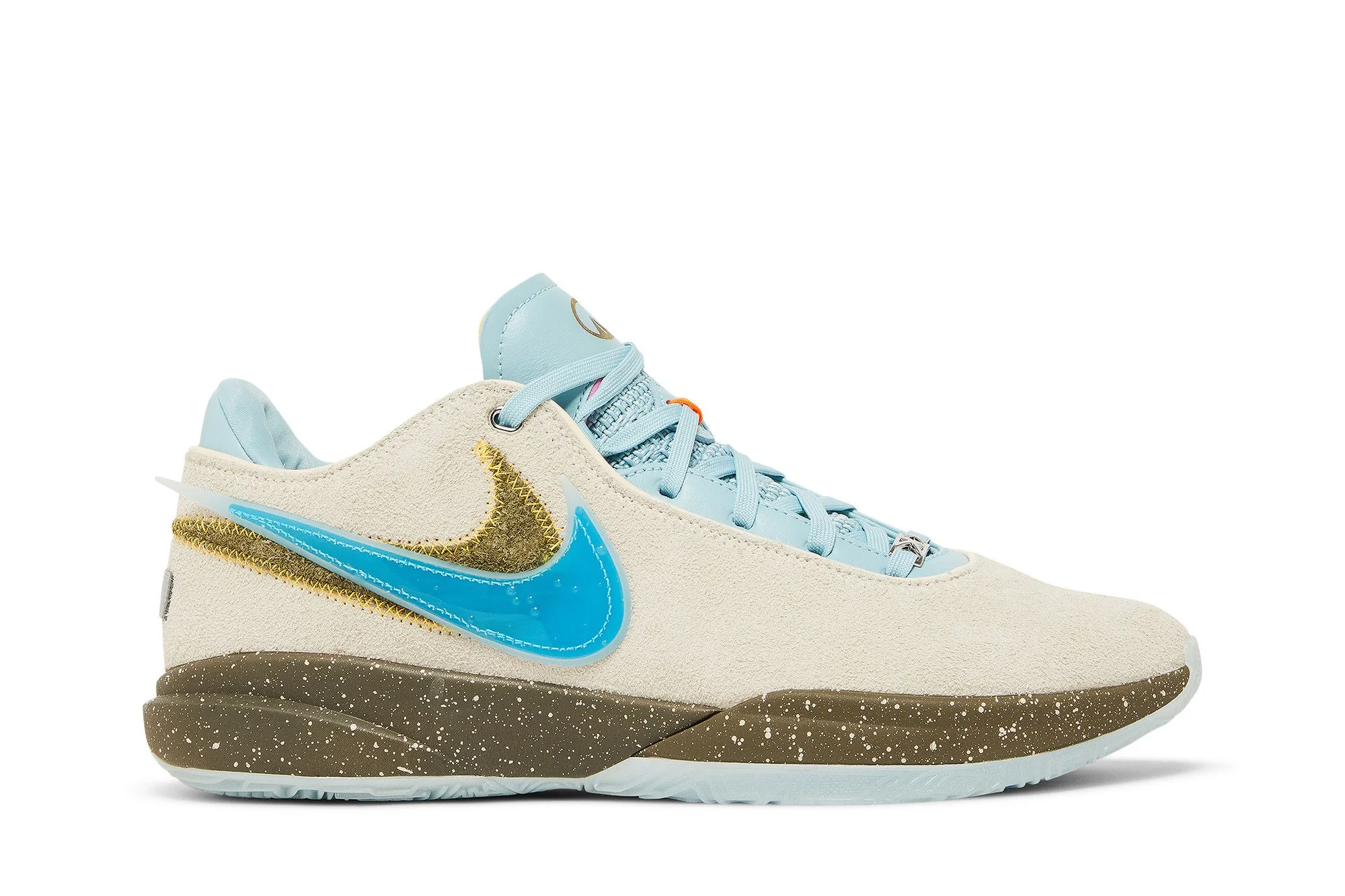 Dressed in tropical Miami-inspired colors, the UNKNWN x Nike LeBron 20 ‘Message in a Bottle’ celebrates the connection forged between one generation of athletes to the next. Composed of shaggy suede in a sandy hue, the upper features a glow-in-the-dark TPU Swoosh on the lateral side, covered in a faux water-droplet effect and stacked atop a second Swoosh outlined in yellow zigzag stitching. Mismatched branding decorates each exposed foam tongue, highlighted by the UNKNWN logo on the right shoe and LeBron James’ signature on the left. Lightweight cushioning arrives via a speckled Cushlon midsole, reinforced underfoot by a translucent glow-in-the-dark rubber outsole. UPPER MATERIAL Suede