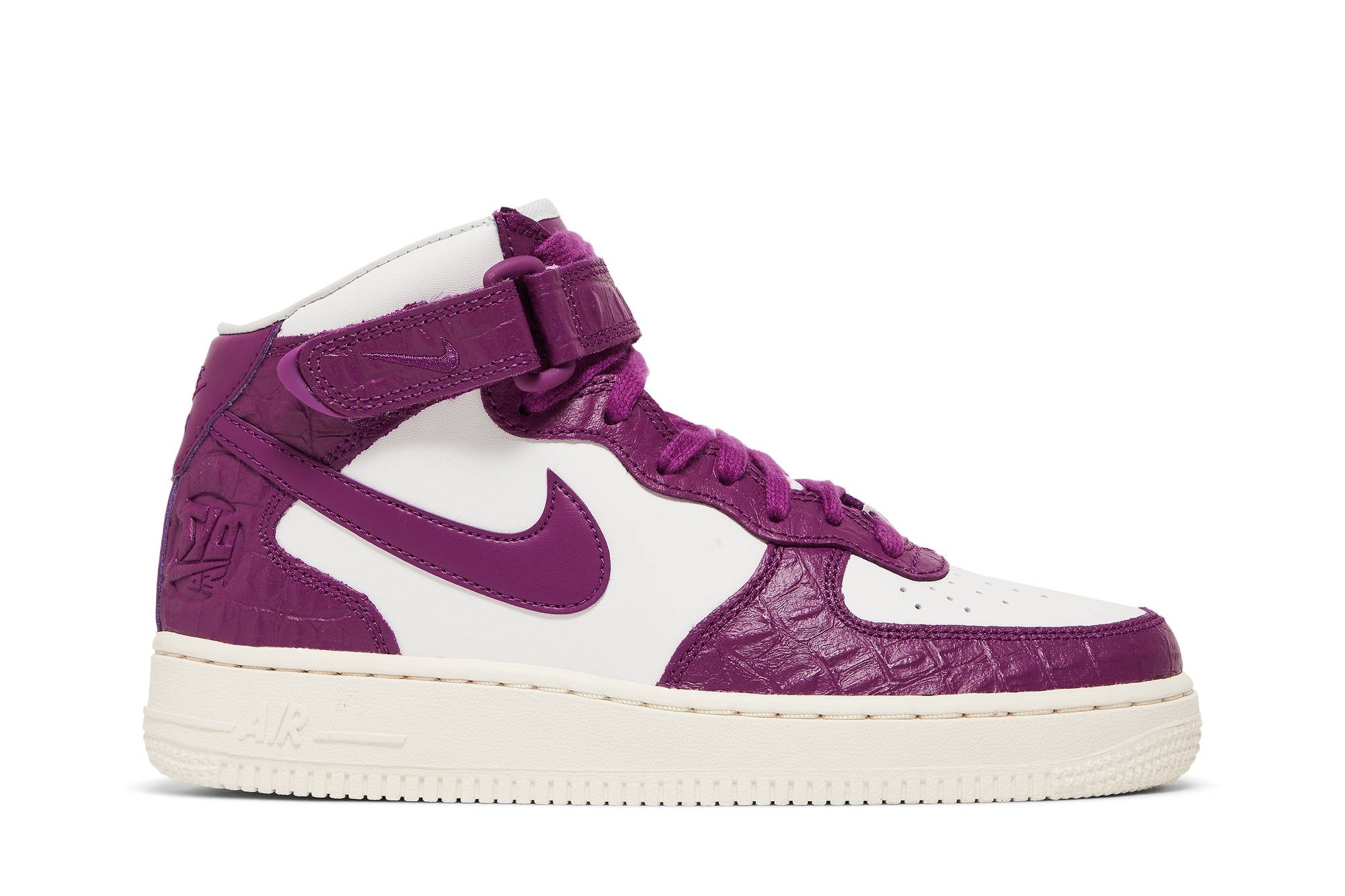 The Nike Women’s Air Force 1 '07 Mid ‘Tokyo 2003’ celebrates the 40th anniversary of Bruce Kilgore’s heritage hoops shoe with reptilian flair. The mid-top dons a white leather upper with croc-embossed overlays in Viotech. The bright violet hue reappears on the Swoosh, Nike tongue tag, and scaly ankle strap. A tonal ‘TYO 03’ graphic adorns the lateral heel. A subtle off-white finish is applied to the rubber cupsole, featuring stitched sidewall construction and encapsulated Nike Air cushioning. UPPER MATERIAL Leather