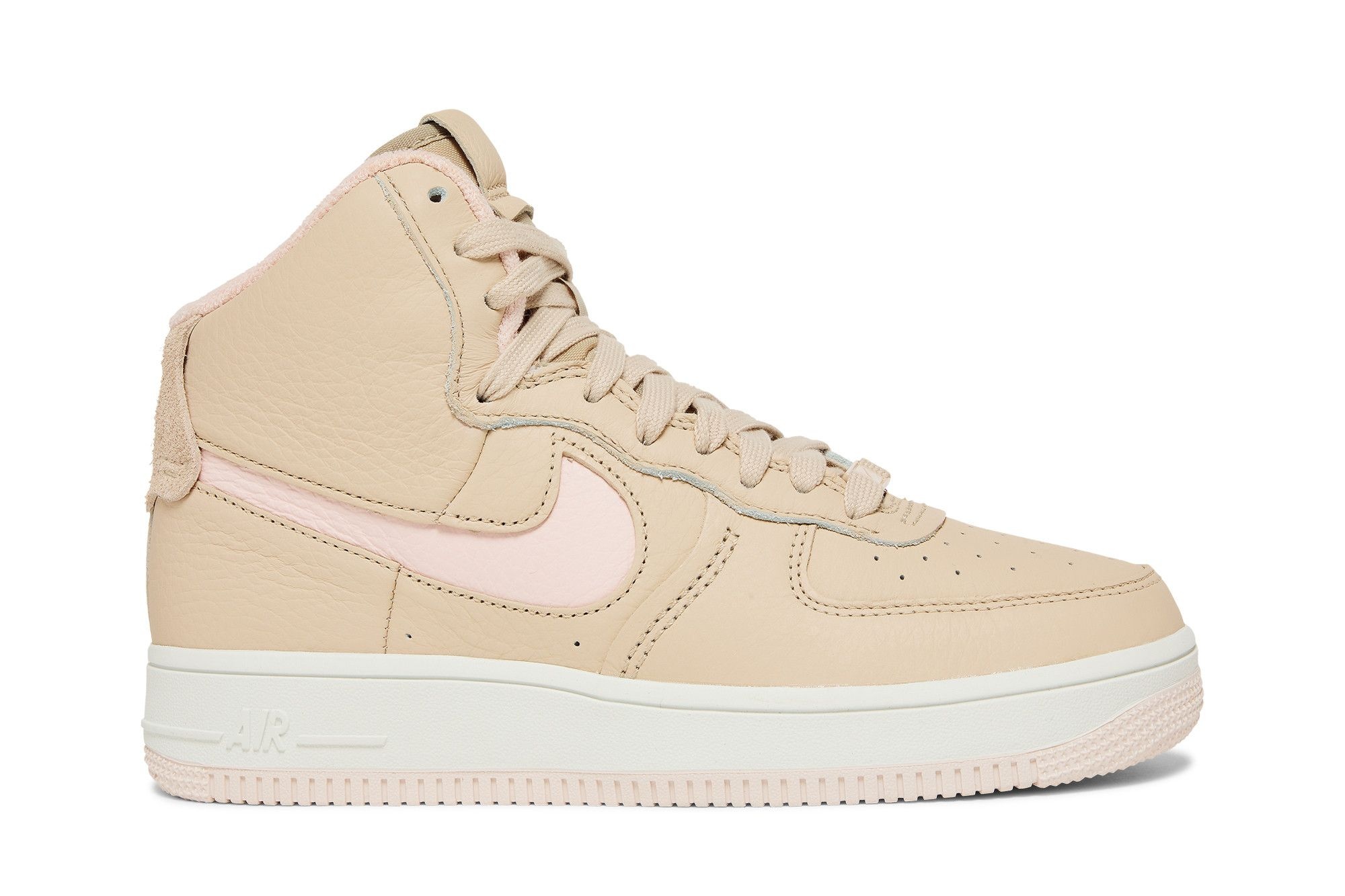 The Nike women’s Air Force 1 High Sculpt ‘Sanddrift’ features a streamlined look that removes the signature ankle strap from the slightly lowered collar. The tan tumbled leather upper is updated with closed seams and a die-cut Swoosh in Light Soft Pink. Nike branding is stripped from the leather tongue tag and suede heel tab, enhancing the shoe’s minimalist aesthetic. The high-top is mounted on a traditional rubber cuspule, fitted with encapsulated Air-sole cushioning in the heel. UPPER MATERIAL Leather