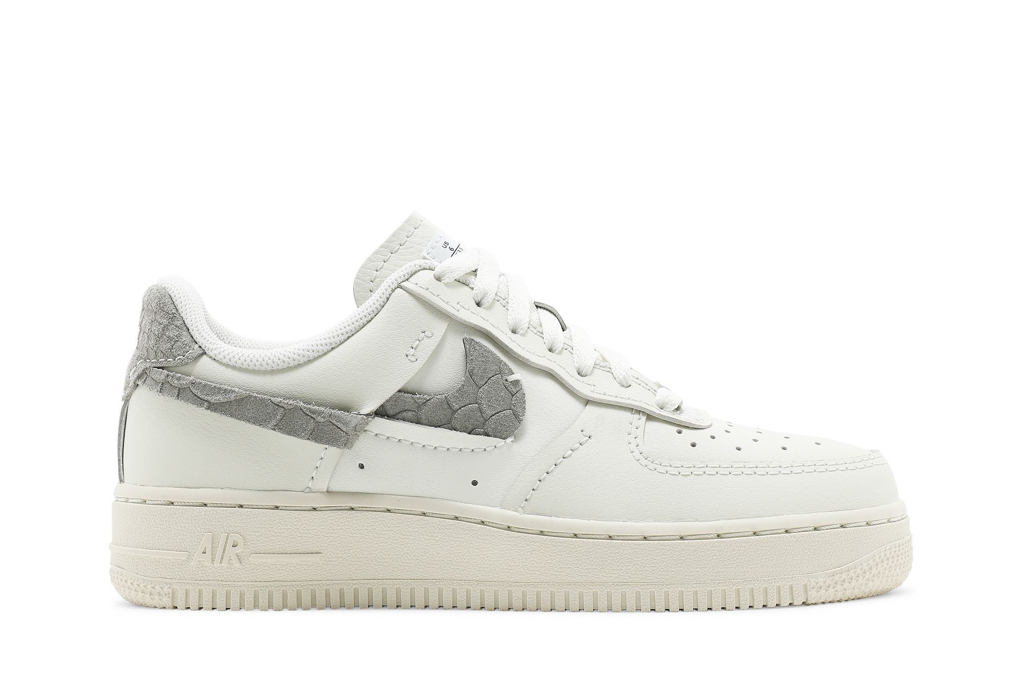 The Nike women’s Air Force 1 LXX ‘Sea Glass Python’ makes use of a cream-hued leather upper updated with refreshed details. They include deco stitching on the eyestay and quarter panels, along with python-textured suede on the heel tab and Swoosh, which is offset and split for a distorted aesthetic. Atop the unlined leather tongue, standard Nike branding is replaced with a factory label. The sneaker rides on traditional AF1 tooling with encapsulated Nike Air cushioning in the heel.
