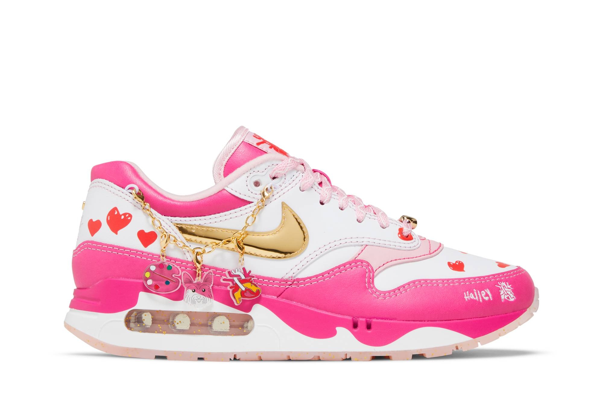 Designed by Hailey Leyva, the Nike Air Max 1 ‘86 OG ‘Big Bubble’ is taken from the Doernbecher Freestyle XIX Collection. The retro runner sports a white and pink leather upper, accented with a signature Swoosh in metallic gold. Five hearts adorn the toe box, hand-drawn by Hailey and representing each member of her family. An anatomical heart graphic appears on the tongue, nodding to Hailey’s medical journey, while squiggly lines on the midsole symbolize the calm of ocean waves. Underfoot, gold glitter enlivens a pink-tinged translucent rubber outsole. The kicks come with a detachable bracelet, festooned with ten charms reflecting a collection of Hailey’s favorite things. UPPER MATERIAL Leather