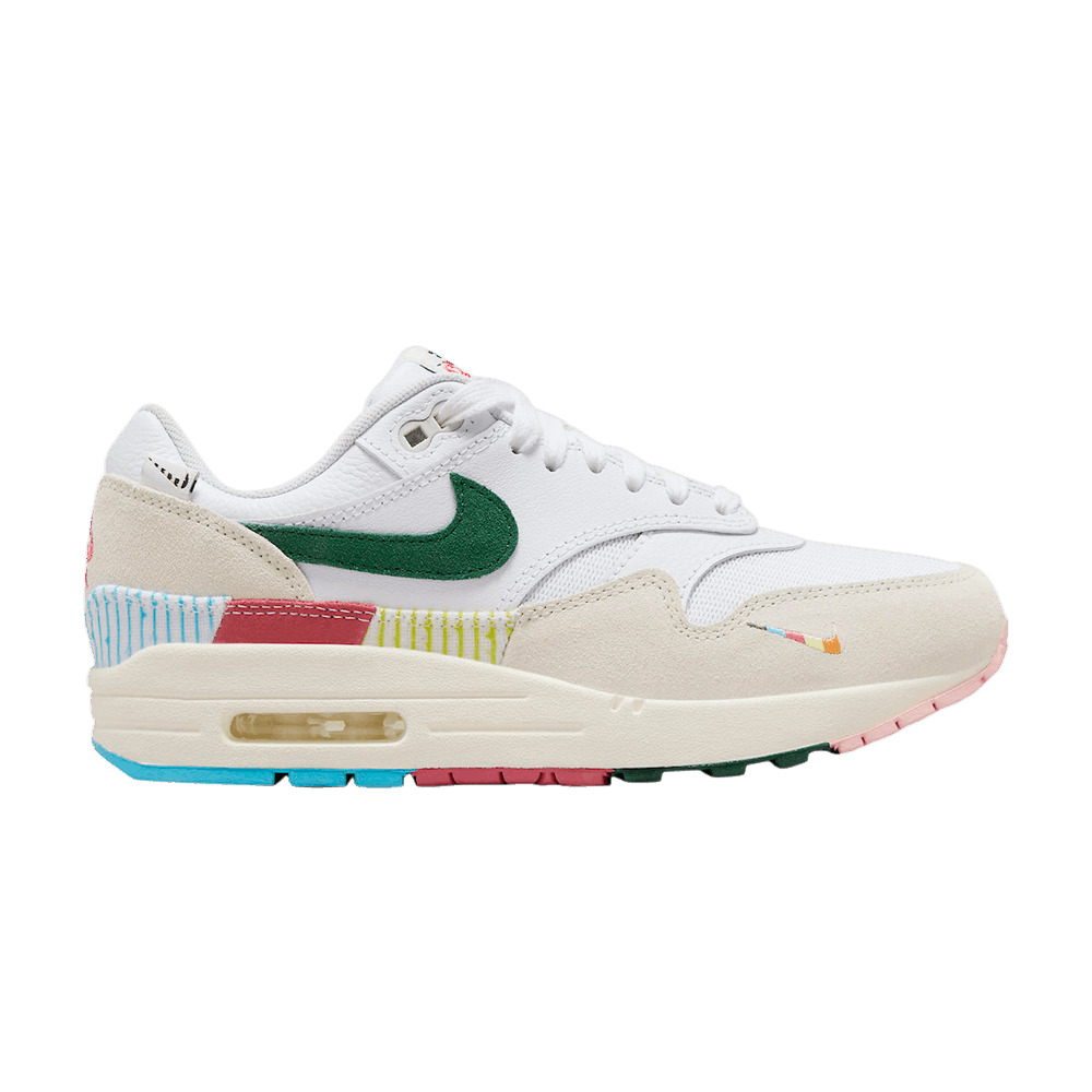 The Nike Women’s Air Max 1 ‘All Petals United’ spotlights florid details that pay homage to the Chinese women’s national football team, nicknamed the ‘Steel Roses.’ The retro runner carries a white mesh upper with tonal leather overlays and a green suede Swoosh. A multicolor mini-Swoosh decorates the patchwork mudguard, featuring an assemblage of off-white suede and striped textiles. A rose graphic appears on the Nike tongue tag, while custom insoles display the tagline ‘All Petals United.’ Lightweight cushioning is provided by an off-white polyurethane midsole, fitted with an Air-sole heel unit and supported by a multicolor rubber outsole. UPPER MATERIAL Suede