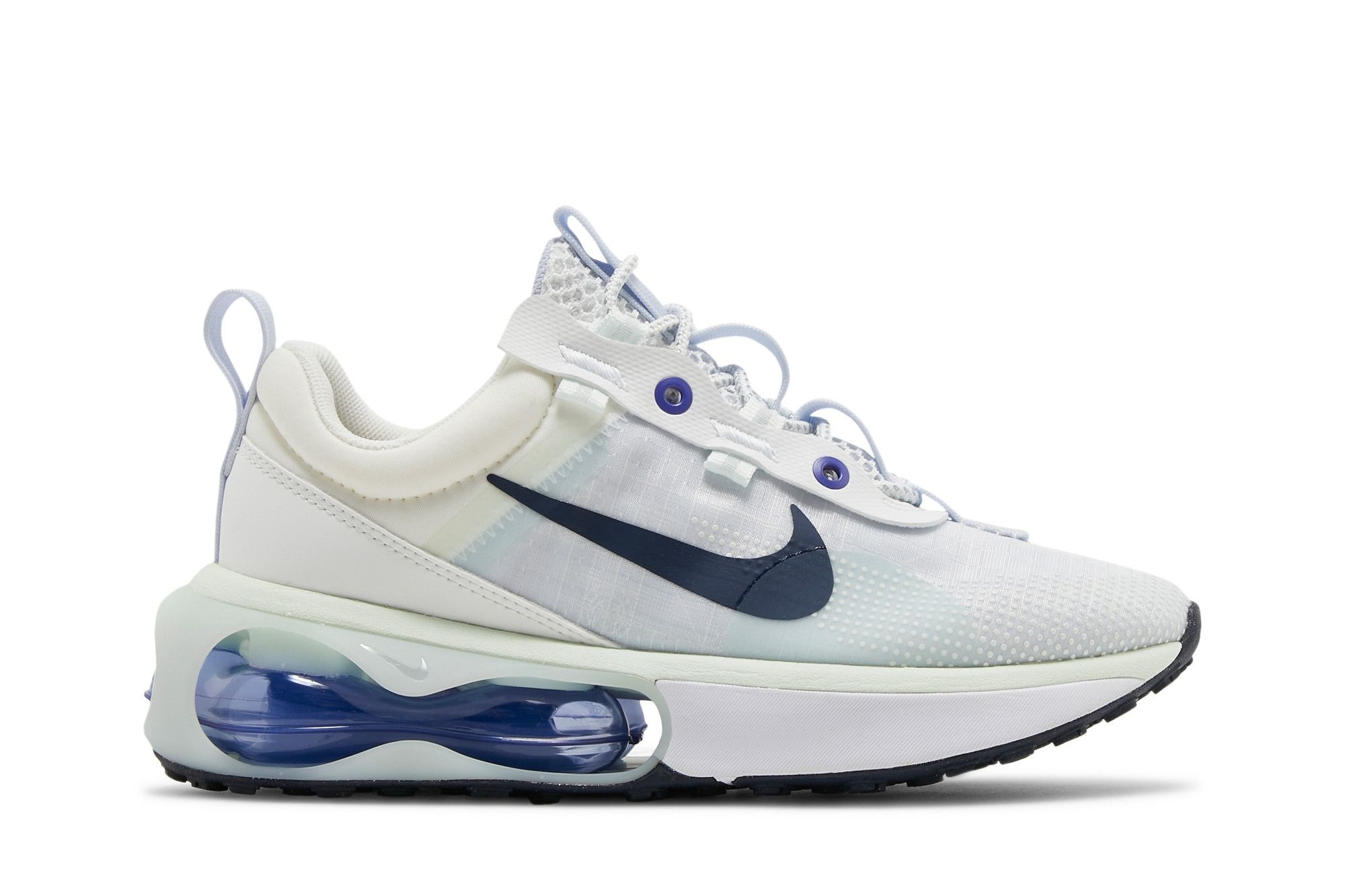 The Nike women’s Air Max 2021 ‘Barely Green’ showcases subtle pops of color on a lifestyle runner that combines updated Air cushioning with a sustainable build incorporating at least 20% recycled content. A faint tinge of blue distinguishes the semi-translucent textile upper, accented with a navy-colored Swoosh and fortified with synthetic leather overlays at the heel and medial quarter panel. A cushy foam midsole features a fully exposed dual-pressure Air-sole unit in the heel, surrounded by a collapsible cage tinted in a pale aqua green finish.