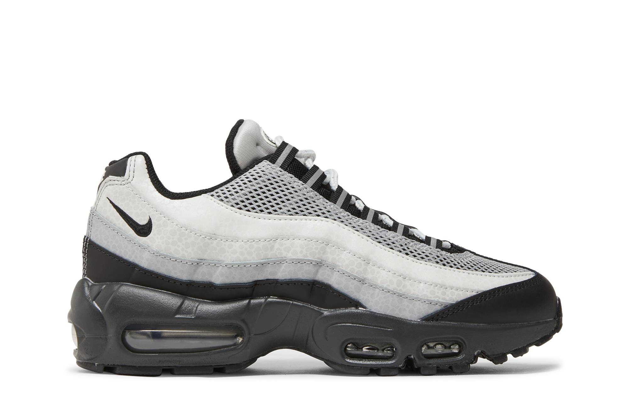 The Nike Women’s Air Max 95 ‘Reflective Safari’ combines a neutral palette with the iconic Nike pattern created by Tinker Hatfield. The upper features grey synthetic leather side panels, covered in a tonal Safari print and treated to a reflective finish. Additional reflective accents land on the webbing eyelets and molded back heel, marked with embossed Nike Air branding. Lightweight cushioning is provided by a black polyurethane midsole with visible Air-sole units nestled in the forefoot and heel. UPPER MATERIAL Leather