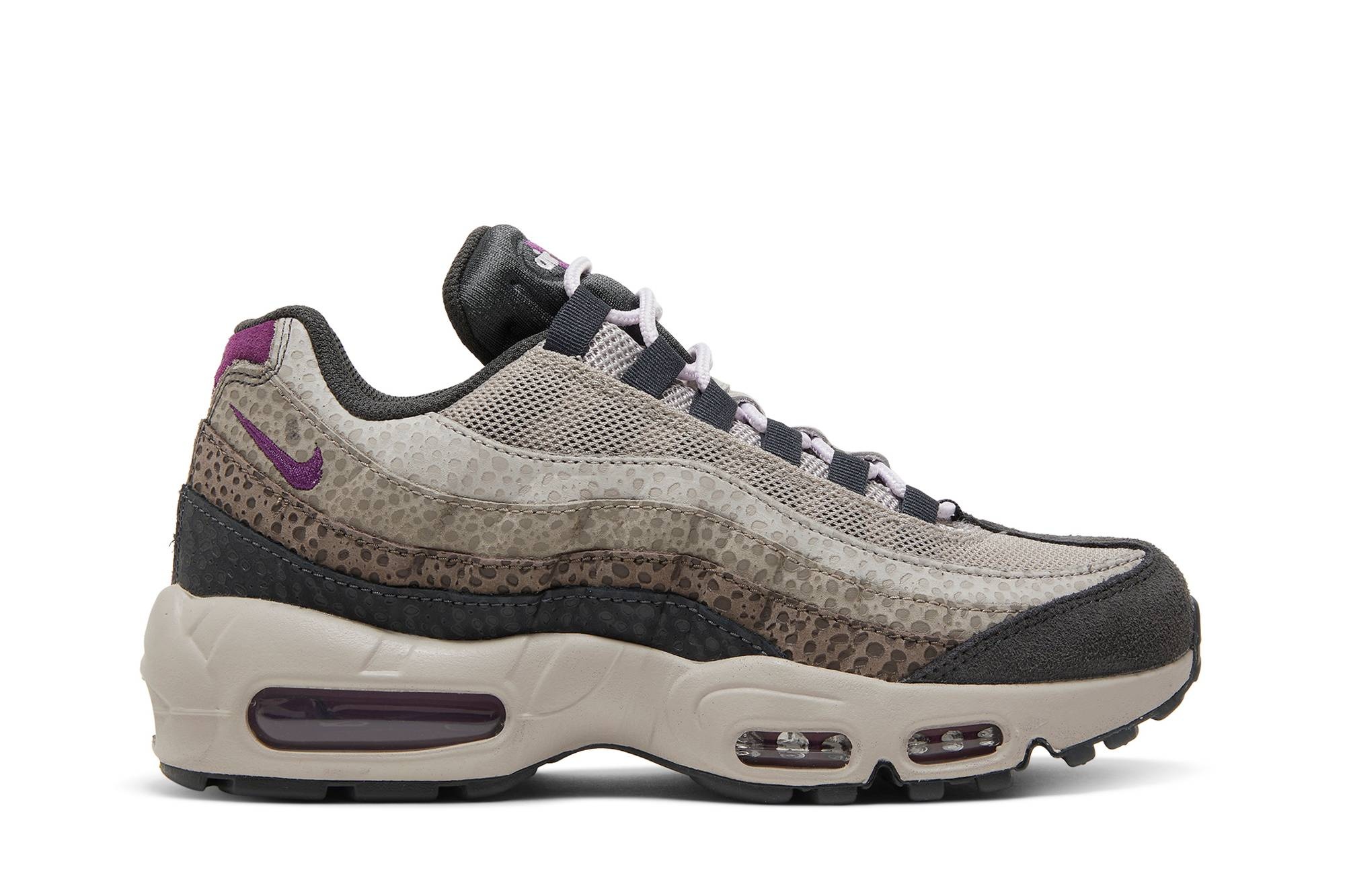 The Nike women’s Air Max 95 ‘Viotech’ brings together sharply contrasting hues with an eclectic mix of materials. On the lateral side, Nike’s iconic safari print is applied to wavy overlays in leather and suede, featuring gradient beige tones with a bottom layer in a neutral olive green hue. The opposite side showcases pink and violet overlays built with alternating layers of suede and corduroy. Lightweight cushioning arrives via a tan polyurethane midsole, enhanced with purple-tinged Air-sole units nestled in the forefoot and heel. UPPER MATERIAL Suede