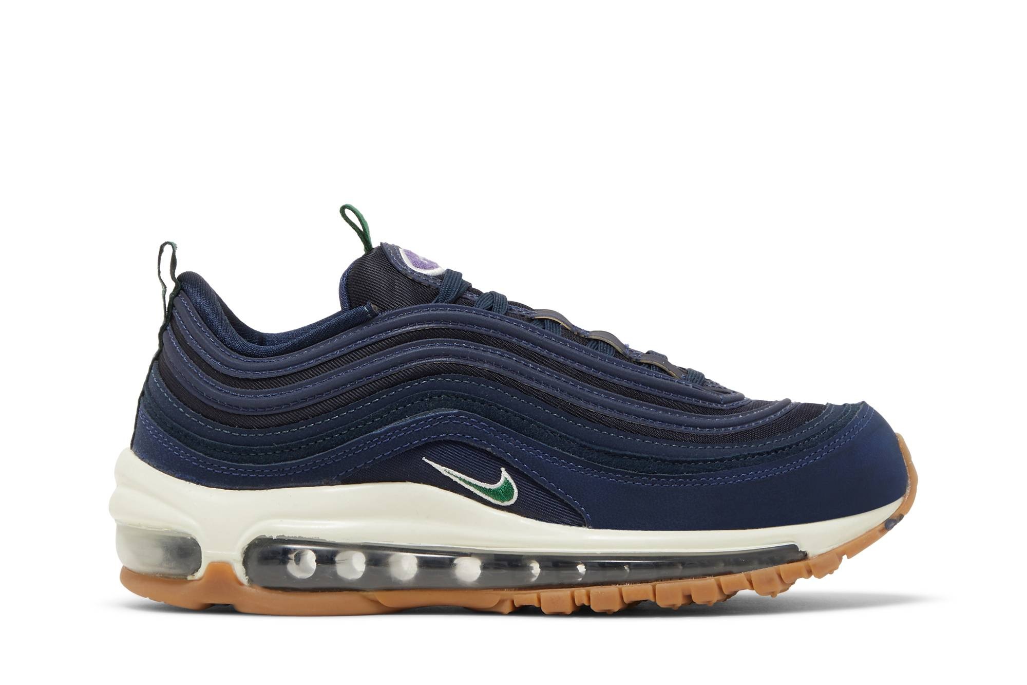 The Nike Women’s Air Max 97 ‘Letterman Pack’ showcases classic varsity hues on the groundbreaking retro runner. The upper is crafted from Obsidian mesh with tonal synthetic leather overlays, featuring a 3M reflective finish for improved visibility in low-light conditions. Green webbing pull tabs at the tongue and heel are matched by an embroidered mini-Swoosh on the quarter panel. Anchoring the sneaker is a white polyurethane midsole, fitted with a purple-tinged Max Air unit that runs the length of the gum rubber outsole. UPPER MATERIAL Textile