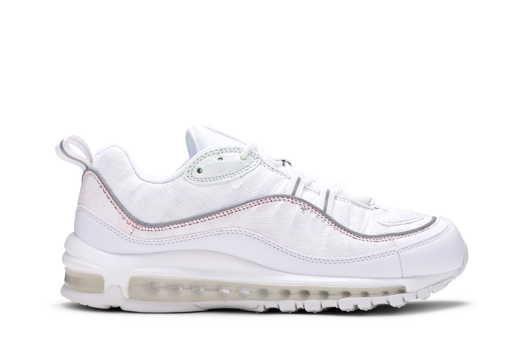 The women’s Nike Air Max 98 LX ‘Cut Away’ makes use of an all-white textile upper that acts as something of a blank slate. The material is designed to be stripped away, as indicated by the subtle ‘Tear Here’ text printed on the toe box. Underneath, multicolor paneling waits to be revealed – a surprise factor denoted by a series of question marks on the sockliner. The kicks come packaged in a clear bag with customization tips printed on the back. UPPER MATERIAL Synthetic