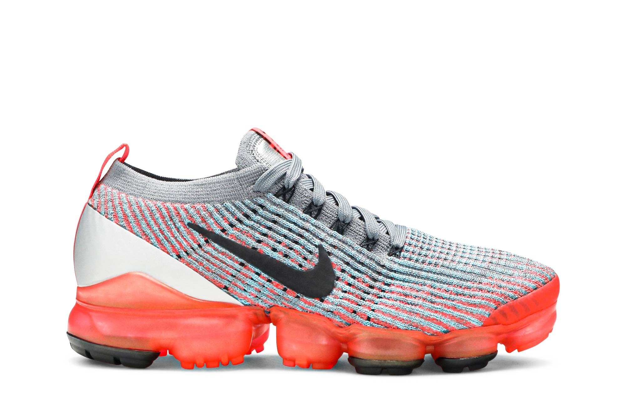 The VaporMax 3, debuted during Air Max month in 2019, modifies the design with the addition of ribbed detailing on the upper. The women's-exclusive Nike Wmns Air VaporMax Flyknit 3 'Flash Crimson' features a sock-like Flyknit construction that weaves together aqua blue with an orange-red. At the bottom, the shoe maintains responsive VaporMax Air bubble cushioning, underscored by rubber traction pods. UPPER MATERIAL Flyknit