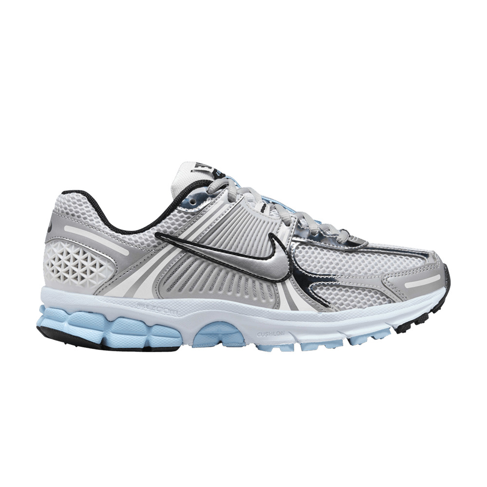 The Nike Women's Air Zoom Vomero 5 'Metallic Silver Blue Tint' sports a ventilated white mesh upper, featuring forefoot overlays and an eyestay in a mirror-reflective finish. A metallic silver Swoosh sits atop the TPU midfoot cage, which is flanked by matte silver overlays accented with 3M reflective detailing. A splash of powder blue enlivens a lightweight Cushlon midsole with encapsulated Zoom Air cushioning in the forefoot and heel. UPPER MATERIAL Mesh