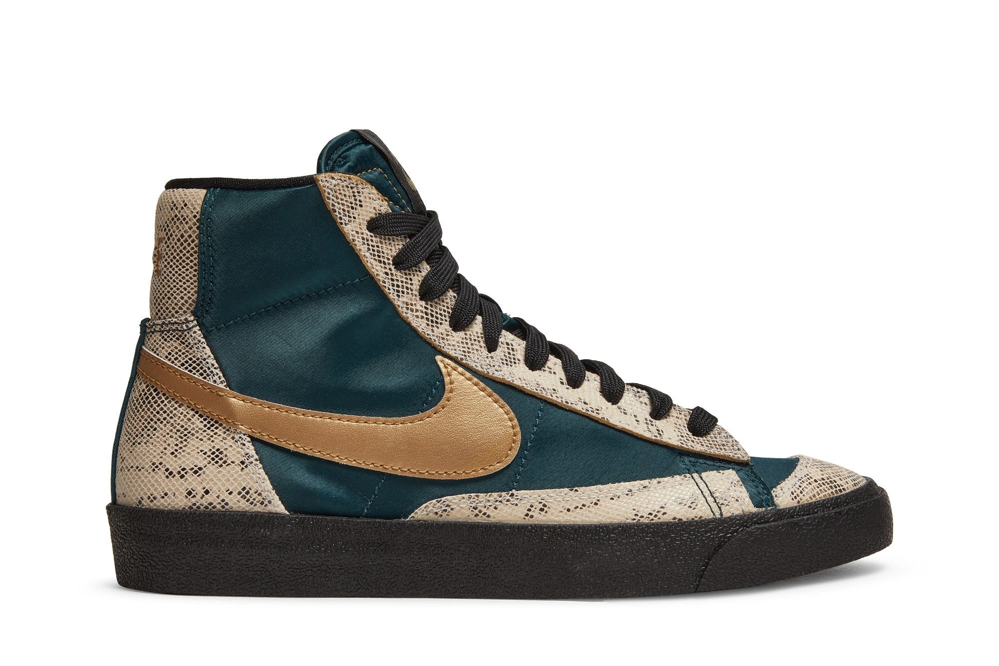 Inspired by the colorful culture of Mexican wrestling, the Nike women’s Blazer Mid ‘Lucha Libre’ makes use of a satiny woven upper in dark teal. Faux snakeskin paneling appears on the eyestay, forefoot and heel, while the retro leather Swoosh is rendered in a metallic gold finish — a nod to the flashy boots worn by luchadores during 1950s and ‘60s. Additional hits of gold land on Nike branding elements atop the woven tongue tag and snakeskin heel tab. The mid-top is mounted on a solid black vulcanized rubber midsole with a herringbone-traction outsole underfoot. UPPER MATERIAL Leather