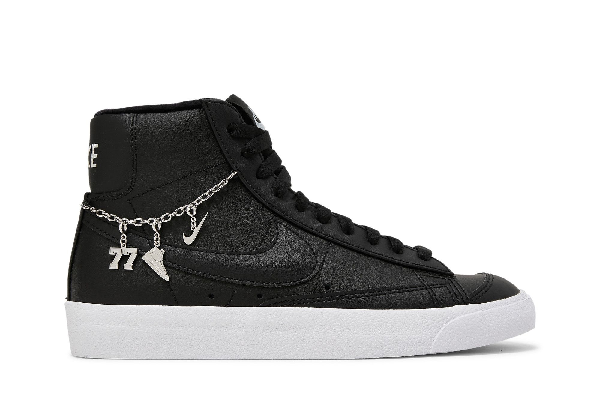 The Nike women’s Blazer Mid ‘77 LX ‘Lucky Charms Black’ accessorizes the vintage hoops shoe with custom hardware. A monochrome black finish is executed on the leather upper, lined in plush velvet and accented with silver Nike branding hits at the woven tongue tag and heel tab. Draped across the collar, a removable metallic silver chain features a trio of matching silver pendants. The sneaker rests on a textured white rubber midsole, supported underfoot by a herringbone-traction rubber outsole. UPPER MATERIAL Leather