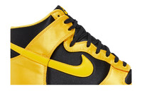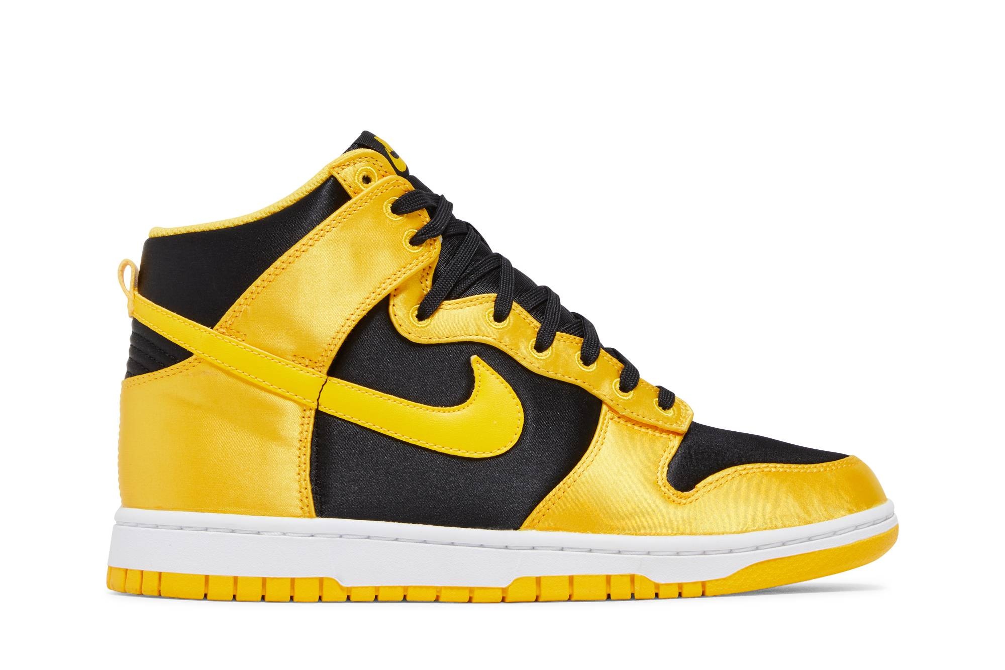 The Nike Women’s Dunk High ‘Satin Goldenrod’ ditches the traditional leather build, instead utilizing a shiny satin upper featuring a black base with Varsity Maize overlays and a color-matched Swoosh. Nike branding appears on the tongue tag and sockliner. Anchoring the sneaker is a standard rubber cupsole, highlighted by white sidewalls and a yellow outsole. UPPER MATERIAL Satin