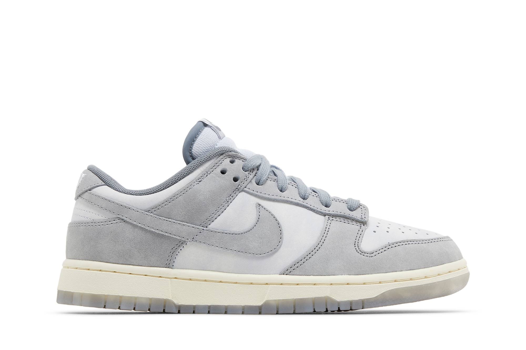 The Nike Women’s Dunk Low ‘Cool Grey’ utilizes varying shades of grey on the leather upper, featuring heritage details like a perforated toe box and a Nike wordmark embroidered on the back tab. Additional Nike branding hits appear on the woven tongue tag and sockliner. A vintage off-white finish is applied to the midsole, which houses a an interior foam wedge for lightweight cushioning. Underfoot, a translucent rubber outsole provides durable traction. UPPER MATERIAL Suede