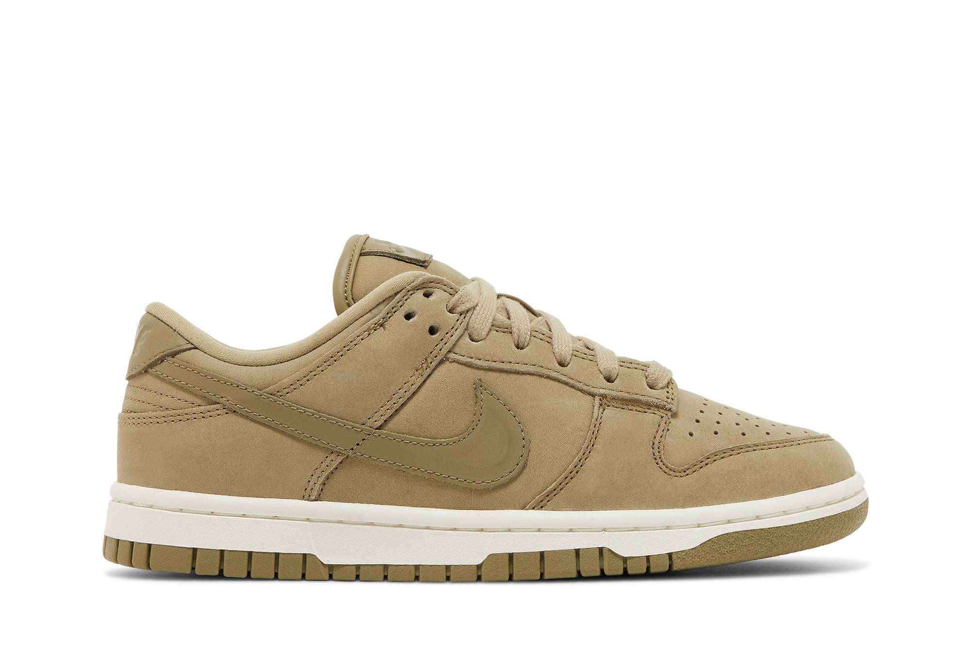 The Nike Women’s Dunk Low Premium ‘Neutral Olive’ merges a subdued one-note finish with an elevated build. A pale green hue permeates the leather upper, equipped with a perforated toe box for improved breathability and a low-cut padded collar for a comfortable fit. Standard Nike branding lands on the leather tongue tag, sockliner and back tab. The low-profile silhouette rests on a stark white midsole, supported underfoot by a durable green rubber outsole. UPPER MATERIAL Nubuck