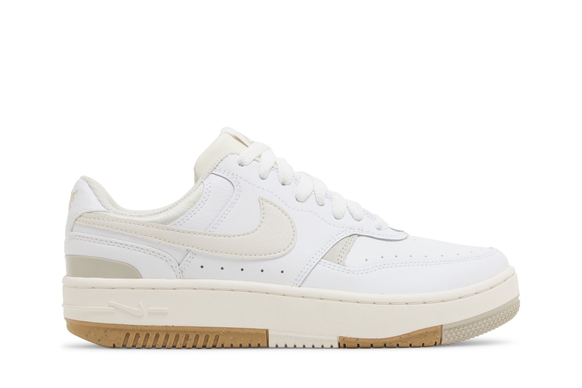 The Nike Women’s Gamma Force ‘White Phantom’ features neutral tones on a casual sneaker inspired by vintage basketball shoes. The low-top makes use of a layered white leather upper, accented with a tumbled leather swoosh in a light tan finish. Perforated detailing along the toe box and midfoot provides improved ventilation, while a padded mesh collar delivers a comfortable fit. A subtle platform midsole gives way to an outsole built with durable Nike Grind rubber throughout the perimeter. UPPER MATERIAL Leather